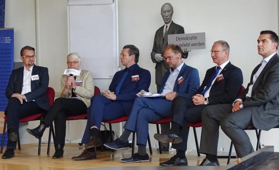 Die Abschlussdiskussion unter Mitwirkung von Staatssekretär Dr. Sebastian Putz, der Journalistin und Autorin Dr. Monika Zimmermann (Regierungssprecherin a.D.), des Oberbürgermeisters Armin Schenk (Stadt Bitterfeld-Wolfen) des Unternehmens Matthias Gabler (Stahlbau Brehna) sowie des Wissenschaftlers und Beraters Dr. André Göbel (Capgemini Deutschland GmbH) fasste die Ergebnisse des Tages zusammen und zeigte auf, dass Deutschland insgesamt und Sachsen-Anhalt im konkreten für die Zukunft gerüstet sind. Am wichtigsten ist dabei die Ausbildung der jungen Menschen, um bereits heute die Voraussetzung für 2030 und die Folgejahre zu schaffen! Wichtig sind aber vor allem die Eigenschaften Offenheit, Neugier und Mut junger Menschen.