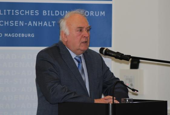 In seinem Eingangsstatement erinnerte der ehemalige Ministerpräsident des Landes Sachsen-Anhalt Prof. Dr. Wolfgang Böhmer nach dem Systemwechsel 1989/1990. Es wurden Demokratie, Freiheit und Meinungsvielfalt gefordert, doch wusste damals niemand, wie alles funktioniert. Böhmer stellte Vergleiche zu anderen Regierungsformen und Wahlsystemen her (z.B. das Mehrheitswahlrecht in Großbritannien oder die Direkte Demokratie in der Schweiz) und erklärte, warum es zur Parlamentarischen Form trotz vorhandener Nachteile keine Alternative gibt. Meinungsbildung durch Parteien ist in Deutschland verfassungsmäßig verankert und auf rechtsstaatlicher Basis etabliert. Dies muss dem Bürger stets verdeutlicht werden, denn nur Meckern ist keine Alternative. Grundsätzlich gehört zur Demokratie, andere Meinung zu akzeptieren, auch innerhalb einer Partei. Als große Herausforderung sieht Böhmer den zunehmenden Rückgang der Wahlbeteiligung. Dem kann nur durch ständigen Dialog zwischen Bürgern und Politikern entgegengewirkt werden.