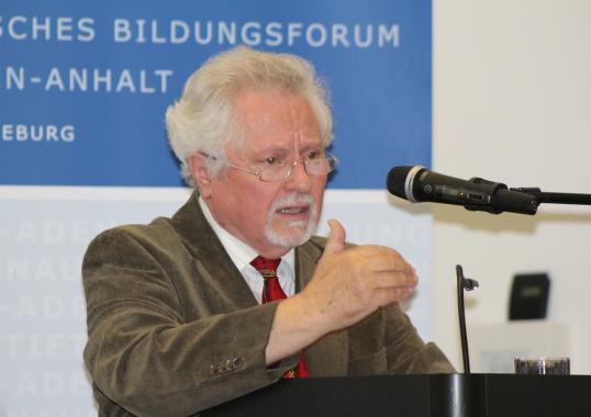 Der ehemalige Oberbürgermeister der Landeshauptstadt Magdeburg Dr. Willy Polte erinnerte ebenfalls an die Anfangszeit 1989/1990 und verwies auf die beiden vergangenen Unrechtssysteme: „Diktaturen schaffen den unmündigen Bürger“, so Polte. Sein Motto „Stellt Euch vor, es ist Demokratie und keiner macht mit“ wurde mit zustimmenden Äußerungen des Publikums kommentiert und zeigte, wie aktuell das Thema Engagement in der Demokratie gerade in der heutigen Zeit ist. Polte sprach u.a. davon, dass auch im 25. Jahr der Wiedervereinigung Deutschlands noch nicht alle Bürger in der Demokratie angekommen sind und bei Problemen eher die einfache Lösung suchen als sich eingehend mit der Thematik zu beschäftigen. Demokratie braucht den bewussten Staatsbürger, der mitgestaltet und sich engagiert. Demokratie und Engagement heißt mitzumachen und sich auch mal „zu schinden“. Als Grundbedingung sieht der ehemalige Oberbürgermeister Magdeburgs die politische Bildungs- und Erziehungsarbeit an, ohne die junge Menschen die Bedeutung von Demokratie und die Möglichkeit des eigenen Engagements nicht erlernen können. Es besteht jedoch die Gefahr, dass Menschen schnell auf von Pegida & Co. propagierte Patentrezepte hereinfallen, die weit von der Rechtsstaatlichkeit entfernt sind. Dennoch, so Polte: „Wir leben heute im besten Deutschland aller Zeiten“. Noch nie habe es soviel Wohlstand, Freiheit, Mitwirkungsrechte und Freunde an den Grenzen gegeben. Doch müsse das demokratische Deutschland jeden Tag verteidigt werden.