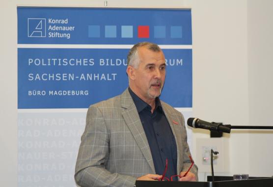 „Volkes Wille ist manchmal schwer zu beschreiben“, damit begann Thomas Keindorf MdL in Sachsen-Anhalt sowie Präsident der Handwerkskammer Halle (Saale) und Vizepräsident des Handwerkstages Sachsen-Anhalt sein Eingangsstatement. Insbesondere aus Sicht der Unternehmer erläuterte Keindorf die Schwierigkeiten und Entfaltungsprobleme, ein eigenes Unternehmen aufzubauen und sich in der heutigen Zeit zu behaupten. Unternehmen verändern die Welt und sind Träger des Fortschritts. Die Nachwuchsfindung ist allerdings enorm schwer und die Zukunft des Mittelstands gefährdet. Für Keindorf beginnt Engagement immer bei einem selbst und kann von niemanden übertragen werden. Die vorherrschende Politikverdrossenheit in der Bevölkerung ist veränderbar, indem man die Lösungsmöglichkeiten für den Bürger erkennbar macht und diese umsetzt. Jeder Bürger ist selbst verantwortlich, etwas für die Demokratie zu unternehmen und die Verantwortung nicht nur auf die „Die-da’s“ abzuwälzen und diese anschließend dafür zu kritisieren. Keindorfs Fazit: „Demokratie ist nicht immer leicht, aber es lohnt sich.“