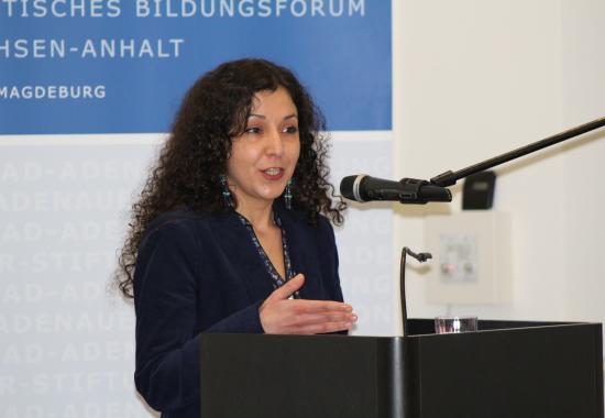 Die aus dem Iran stammende Somaiyeh Mohammadi, Promotionsstipendidatin der Konrad-Adenauer-Stiftung e.V. und Literaturpreisträgerin der Martin-Luther-Universität Halle, sprach in Ihren Ausführungen über ihre persönlichen Erfahrungen: In den 1980er Jahren erlebte sie einen Krieg mit. Auch aus dieser Erfahrung heraus sind Freiheit und Sicherheit die zentralen Punkte, für die sie heute junge Menschen für die Demokratie begeistert. Demokratische Freiheiten und die Wertschätzung für die Demokratie sind aus Mohammadis Sicht für viele Deutsche geschwunden und bei einigen Bürgern ganz verloren gegangen. Sie verwies darauf, dass weltweit Menschen für diese Werte kämpfen und ihr Leben lassen. Auch hier kann jeder etwas mit seinem Engagement für die Demokratie in Deutschland und weltweit leisten. Für Mohammadi bedeutet das u.a., dass man jungen Menschen Demokratie erklären muss - sonst werden sie mutlos. Durch Nichtwahl verstummt unsere Stimme – dies ist gleichbedeutend mit der Wahl radikaler Kräfte.