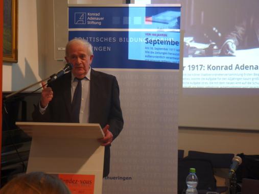 Am 10. November 2017 lud das Politische Bildungsforum Thüringen der Konrad-Adenauer- Stiftung gemeinsam mit dem Weimarer Republik e.V. im Rahmen des Geschichtsfestivals Weimarer Rendez-vous zu einem Vortrag mit anschließendem Podiumsgespräch: „Bindung nach Westen, Verständigung nach Osten-Adenauer und die Außenpolitik der jungen Bundesrepublik“ in das Weimarer Stadtmuseum ein. Die jahrzehntelange Verfälschung des Adenauer-Bildes in der ehemaligen DDR wirkt noch in vielen Köpfen nach. Daher ist es der Konrad-Adenauer-Stiftung ein dauerhaftes Anliegen, dieser Verzerrung entgegenzuwirken.