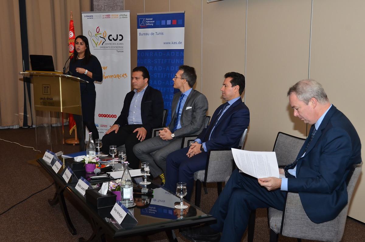« Selon l'édition 2018 de l'indice Doing Business, la Tunisie a perdu cette année 11 places pour se retrouver à la 88ème place mondiale, perdant 46 places en 7 ans. L’analyse de cet indice montre que la Tunisie fait face à un problème structurel : la bureaucratie. La longueur des délais ainsi que la lourdeur et la complexité des procédures administratives font que l’une des réformes majeures les plus attendues en Tunisie est celle de l’administration publique » a affirmé Wafa Laâmiri, présidente du CJD, lors de l’ouverture du petit-déjeuner débat sur « la réforme de l’administration » organisé le 23 novembre par le CJD et la KAS.