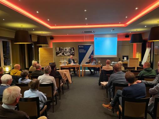 Prof. Dr. Hilligweg spannte zunächst den volkwirtschaftlichen Rahmen auf. Die Soziale Marktwirtschaft verbindet marktwirtschaftliche Freiheit mit sozialer Absicherung. Ziel ist es, einen freien Wettbewerb zu ermöglichen, zugleich aber für sozialen Ausgleich zu sorgen und gesellschaftlich Schwächere zu schützen. Im weiteren Teil widmete sich der Referent den gegenwärtigen Herausforderungen. Im Zentrum steht der demografische Wandel. Sinkende Geburtenraten und eine steigende Lebenserwartung verändern die Bevölkerungsstruktur grundlegend. Die bekannte Annahme „Kinder kriegen die Leute immer“ (Zitat Konrad Adenauer) erweist sich angesichts langfristig niedriger Geburtenraten als trügerisch. Die Verschiebung der Altersstruktur hat erhebliche Auswirkungen auf die gesetzlichen Sicherungssysteme – insbesondere auf Renten-, Kranken- und Pflegeversicherung. Weniger Beitragszahler stehen einer wachsenden Zahl von Leistungsempfängern gegenüber. Damit geraten die umlagefinanzierten Systeme zunehmend unter Druck. Auch die Entwicklung des Bundeshaushaltes verdeutlicht, wie stark Sozialausgaben inzwischen die staatlichen Finanzspielräume prägen. Abschließend diskutierte Prof. Dr. Hilligweg mögliche Lösungsansätze. Er sprach von verschiedenen „Stellschrauben“, an denen angesetzt werden könne: etwa bei der Lebensarbeitszeit, der Beitrags- und Leistungsstruktur, der stärkeren Kapitaldeckung oder bei familienpolitischen Maßnahmen zur Stabilisierung der Geburtenrate. Auch eine höhere Erwerbsbeteiligung – beispielsweise durch längeres Arbeiten oder eine bessere Integration bislang ungenutzter Arbeitskräftepotenziale – wurde thematisiert. Prof. Dr Hilligweg appellierte an die Politik mutig zu sein und die Probleme jetzt anzugehen, da es sonst zu immer größeren volkwirtschaftlichen Folgen kommen werde.