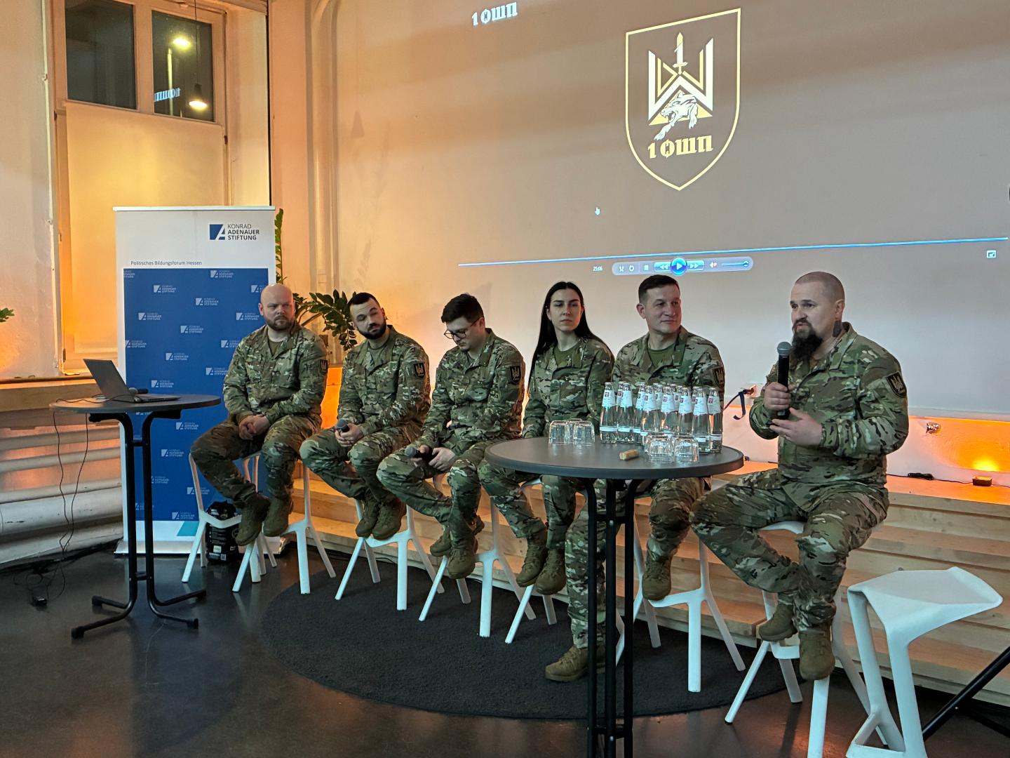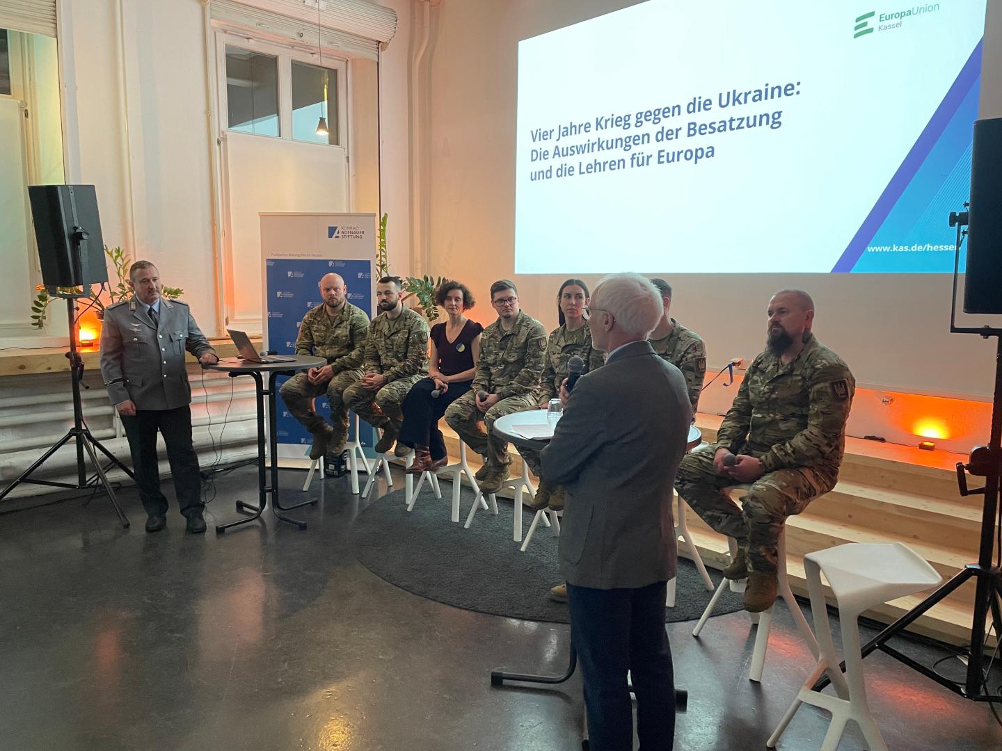 Die Veranstaltung rundete ein Podiumsgespräch inkl. Beteiligung des Publikums ab, moderiert vom Sicherheitsexperten Jürgen Fischer. Neben den sechs Soldaten und Elwira Niewira nahm mit Oberst Thomas Blum, Standortältester und Regimentskommandeur des Kampfhubschrauberregiments 36 in Fritzlar auch ein Vertreter der Bundeswehr teil. Er verwies auf die Aktivitäten der NATO und die Ausbildung ukrainischer Soldaten bei der Bundeswehr, gab aber auch zu, noch nicht kriegstauglich zu sein. Man lerne viel von der Ukraine, insbesondere eine neue Art der Kriegsführung. Die ukrainischen Soldaten bestätigten: Krieg bestehe heute aus einzelnen, kleinen, schnellen Manövern und Drohnen seien zentral für die Kampfhandlungen – aber Technologie sei nicht alles. Europa müsse aufwachen, die Friedenszeit sei vorbei, der Kontinent stehe bereits als Ganzes im Krieg.