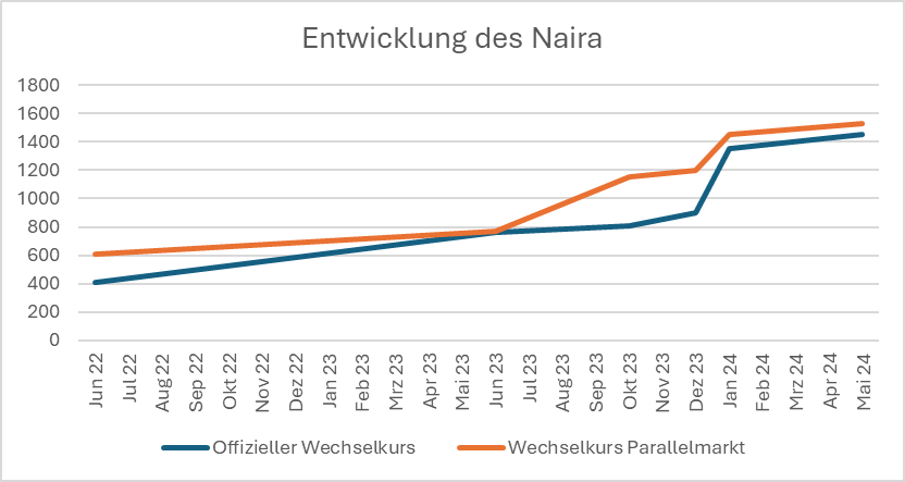 - Als zweite zentrale Maßnahme reformierte Präsident Tinubu die nigerianische Währung, den Naira. Nach Jahren eher protektionistischer Maßnahmen durch eine künstliche Bindung des Wechselkurses an den US-Dollar, soll das Interesse ausländischer Investoren durch die Abschaffung dieser staatlichen Intervention (Wechselkursbindung), gesteigert werden. Das Ziel ist ein langfristiger Anstieg von ausländischen Devisen durch verstärkte Importe. Um dies zu erreichen, wurden die zwei parallel existierenden Wechselkurse angeglichen. Neben dem staatlich festgelegten Wechselkurs hatte sich über Jahre hinweg ein Parallelmarkt für den Ankauf von ausländischen Währungen wie dem Dollar, dem Euro oder dem britischen Pfund entwickelt. Zwar konnte mit der Auflösung der Bindung des staatlichen Kurses eine Angleichung der beiden Wechselkurse erreicht werden, jedoch befindet sich der Naira weiter auf Talfahrt. Denn die gewünschte Wirkung ist eben nicht eingetreten, da sich der offizielle Wechselkurs eher an den des Parallelmarktes angeglichen hat und nicht umgekehrt. Hinzu kommt eine langanhaltend hohe Inflation, die die Währung stark unter Druck setzt – die Inflation lag im März 2024 bei 33,2%. Zum Vergleich: Lag der offizielle Wechselkurs im Mai 2024 bei ca. 1450 Naira zu einem Dollar, lag dieser Wert im März 2023 noch bei ca. 460 Naira. Auf dem Parallelmarkt lag der Wert Anfang 2023 noch bei ca. 770 Naira für einen Dollar, heute sind es 1550 Naira.
