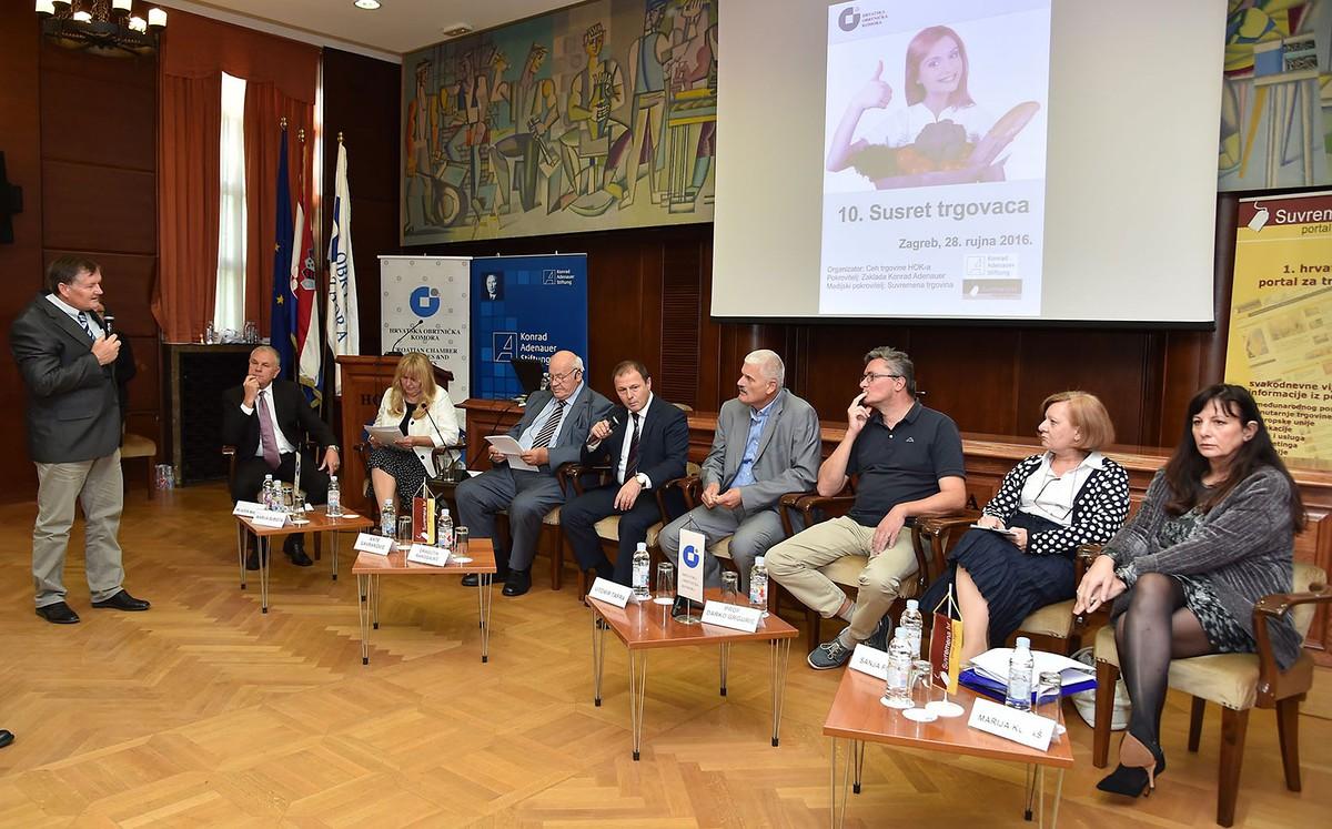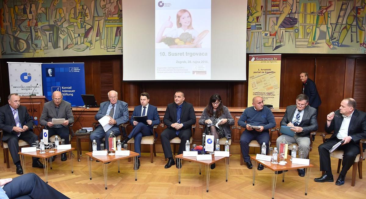1. panel, s lijeva na desno: Ivan Bajsić (predsjednik Ceha trgovine Krapinsko-zagorske županije), Franjo Božak (Ceh trgovine HOK-a), moderator Ante Gavranović (Zagrebačka inicijativa), doc. dr. sc. Krunoslav Karalić (Ministarstvo poljoprivrede), Damir Juzbašić (Ministarstvo gospodarstva), Maria Kulaš (Ministarstvo gospodarstva), Ivan Čibarić (Ceh trgovine HOK-a), prof. dr. sc. Nikola Knego (Ekonomski fakultet Sveučilišta u Zagrebu) i Dušan Vrban (predsjednik Ceha trgovine Zadarske županije)