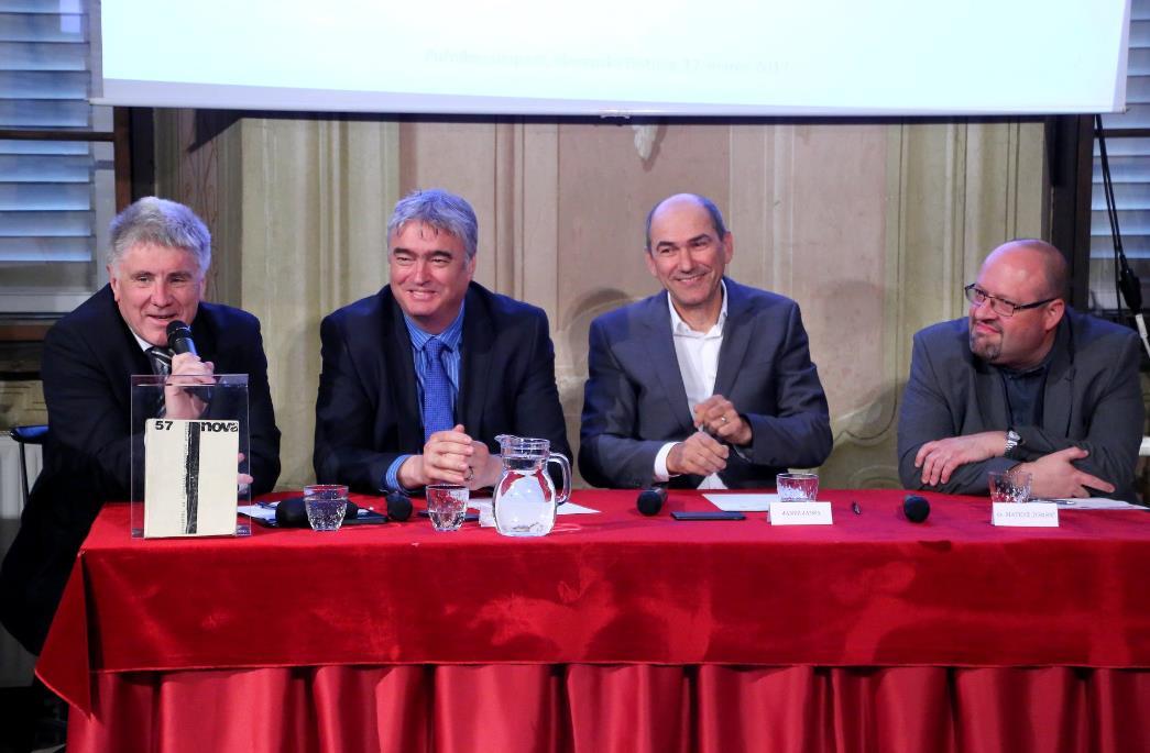 Panel rasprava, s lijeva na desno, moderator Miro Petek (član SDS-a), zastupnik u Europskom parlamentu dr. Milan Zver (SDS/EPP, voditelj slovenske EPP delegacije u Europskom parlamentu, Janez Janša (predsjednik SDS-a i biši predsjednik Vlade Republike Slovenije) i prof. dr. Matevž Tomišič (Fakultet za društvene studije u Novoj Gorici)