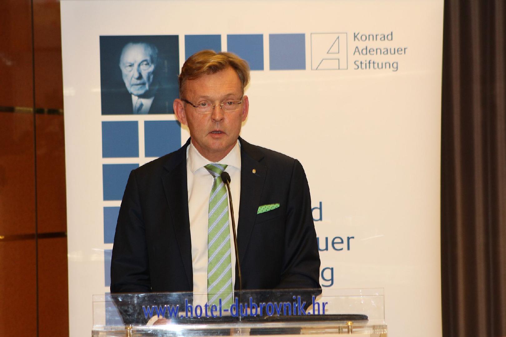 Der ständige Vertreter des deutschen Botschafters und Leiter des Wirtschaftsreferats der deutschen Botschaft in Zagreb, Harald Siebel, betonte in seinem Grußwort, dass wir in einer Welt leben, deren Zukunft nur schwer vorhersehbar sei, wobei man sich heute vor großen Herausforderungen, in Bezug auf Naturschutz und Klimapolitik, befinde. Er wies darauf hin, dass man sich heute viel mehr im Klaren sei, dass Atomenergie zu gefährlich und fossile Brennstoffe ungenügend sauber seien. Er unterstich die deutsche Energiewende als gutes Beispiel für Andere und betonte, dass man Energie nicht zum Konfliktauslöser heranwachsen lassen sollte.
