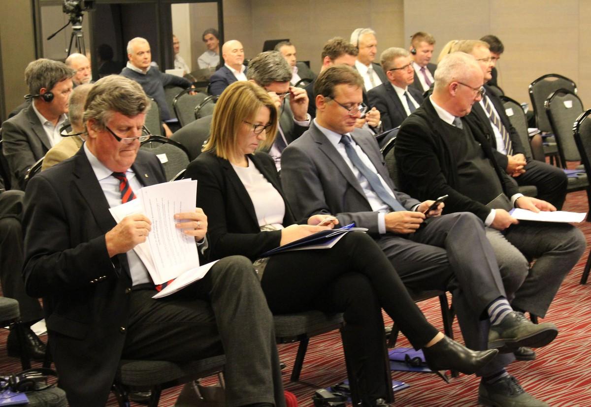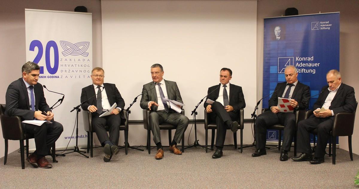Panel rasprava, s lijeva na desno, moderator Josip Šarić (gradonačelnik grada Otoka), Željko Turk (gradonačelnik grada Zaprešića), Zlatko Ževrnja (župan Splitsko-dalmatinske Županije), Alojz Tomašević (župan Požeško-slavonske županije) i Goran Pauk (župan Šibensko-kninske županije)