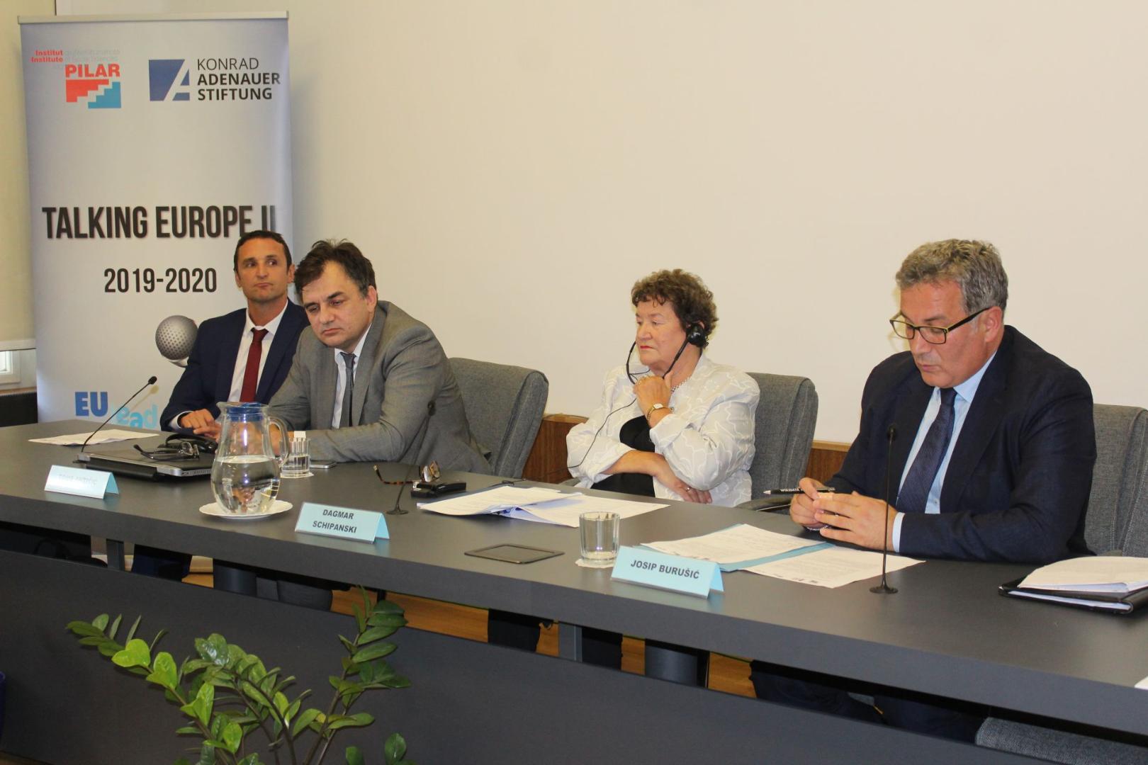 Podiumsdikussion, v. l. n. r. Božo Pavičin, Bildungsabteilung, Kroatische Handelskammer, Kroatien; Dr. Tome Antičić, Staatssekretär, Ministerium für Wissenschaft und Bildung. Kroatien; Prof. Dr. Dagmar Schipanski, Mitglied des Bundesvorstands der CDU, Deutschland und Moderator Dr. Josip Burušić, Institut für Sozialwissenschaften Ivo Pilar, Zagreb; Vorstandsmitglied der Stiftung Wissen am Werk, Zagreb