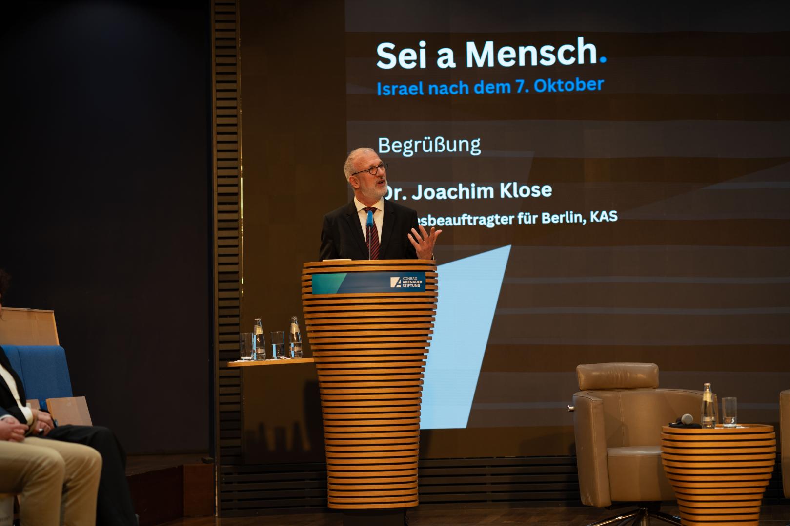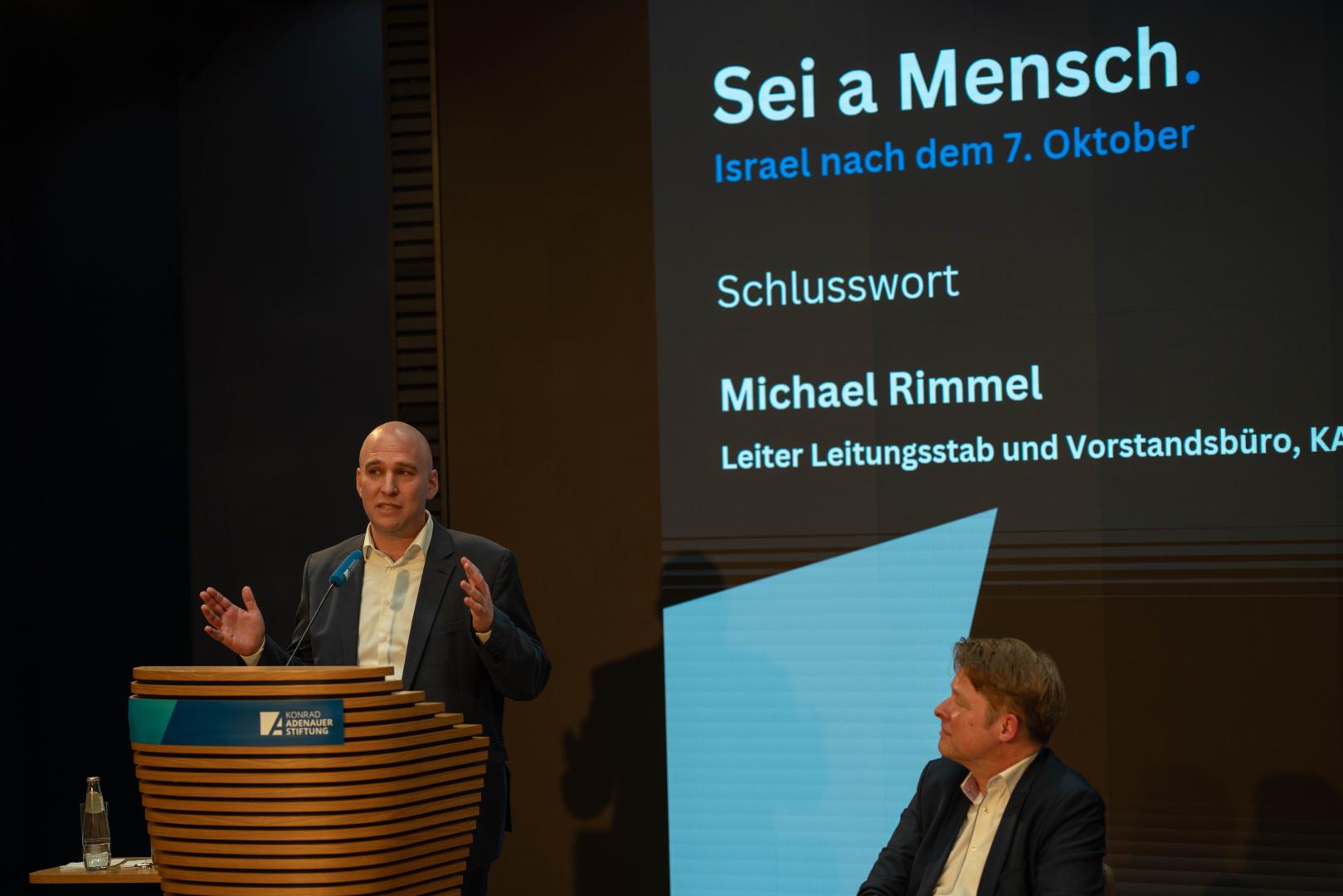 In seinem Schlusswort hob Michael Rimmel, Leiter Leitungsstab der Konrad-Adenauer-Stiftung, hervor, wie wichtig es sei, zusammenzustehen und Israel zu unterstützen. Er dankte in diesem Zusammenhang allen Mitwirkenden der Vernissage und insbesondere allen Mitarbeiterinnen und Mitarbeiter der Stiftung, die sich für Israel, unsere jüdischen Mitbürger und für ein friedfertiges Zusammenleben einsetzen.