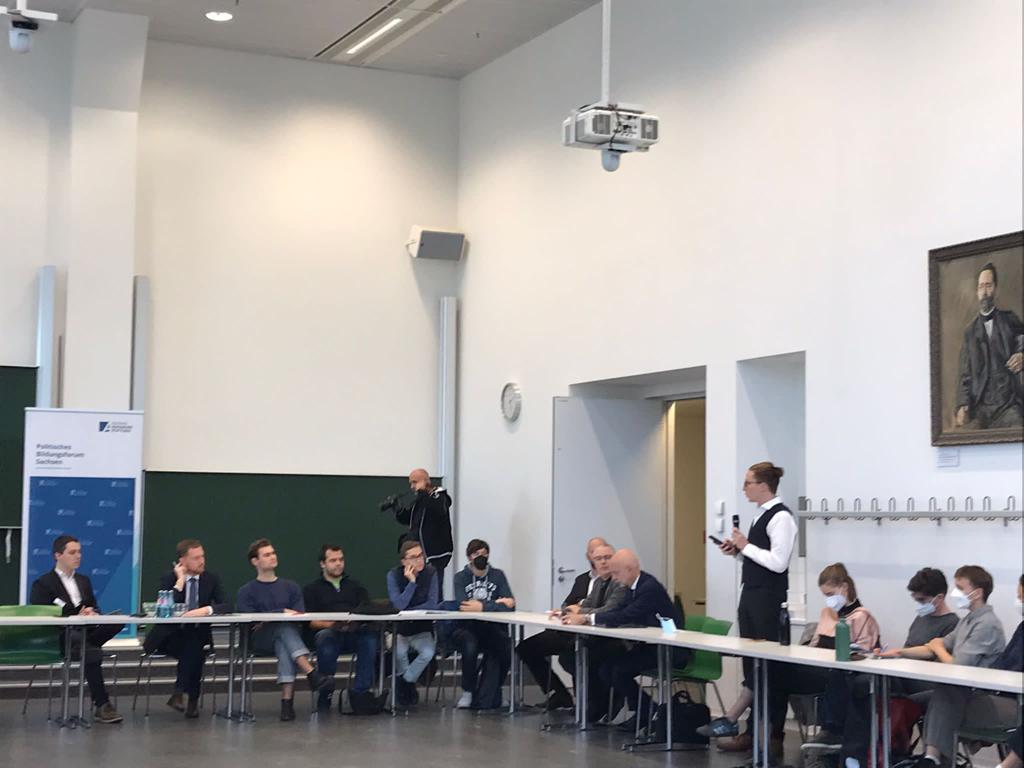 Am 26. September fand unter dem Titel „Vernetzt? Versiert? Vergessen?“ ein Gespräch mit Studierenden und Ministerpräsident Michael Kretschmer im Felix-Klein-Hörsaal der Universität Leipzig statt. Drei Studierende gaben zu je einem der 3 Themenfelder einen Impuls. Jakob Schons, der zu Digitalisierung und Qualität der Lehre sprach, bemerkte Folgendes: „Digitalisierung ist kein Zustand der erreicht ist, sondern ein Prozess welcher sich ständig weiterentwickelt.“ Damit fasste er genau die Problematik zusammen, welche sich zur Zeit der Corona-Pandemie in den Universitäten abzeichnete. Im Themenfeld Hochschulpolitik und studentische Selbstverwaltung wurde angemerkt, dass es fast unmöglich sei, Ideen umzusetzen, da man in den Räten immer die Minderheit ist, obwohl die Studierenden den Großteil der Universität ausmachen. Das Themenfeld Inklusion und Chancengleichheit sorgte für viel Gesprächsstoff, denn hier empfanden viele Studierende die Hilfestellung für benachteiligte Menschen als nicht ausreichend. Der Ministerpräsident versprach, diese Problematik bei den Kanzlern anzusprechen. Bei der Frage an den Ministerpräsidenten, ob es wichtiger wäre, dass eine Universität exzellent oder inklusiv sei, antwortete der Ministerpräsident, dass eine Universität erst exzellent sei, wenn diese auch inklusiv arbeite. Zum Ende der Veranstaltung hatten die Studierenden in einer offenen Fragerunde noch die Möglichkeit, aktuelle tagespolitische Themen anzusprechen, welche mit großem Interesse genutzt wurde.
