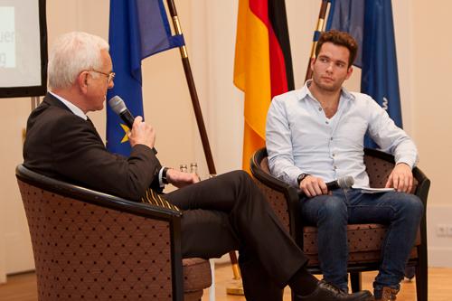 Nach dem Vortrag folgte ein Generationengespräch zwischen dem Juniorbotschafter des Deutsch-Französischen Jugendwerks, Nils Thieben und Dr. Hans-Gert Pöttering MdEP. Nils Thieben nutzte die Gelegenheit um, stellvertretend für die jüngere Generation, von den Erfahrungen Pötterings zu lernen und interviewte den Europapolitiker. Auf seine Fragen bekam er zum Teil sehr persönliche Antworten. Pöttering erzählte von seinem Weg in die Europapolitik, rief dazu auf, den Mut bei der Weiterentwicklung der Einheit Europas nicht zu verlieren und mit Leidenschaft für europäische Ziele einzutreten. Der jungen Generation gab er mit auf den Weg dass zu tun, woran sie glaubt und nicht einzuknicken, wenn politischer Gegenwind weht. Außerdem forderte er dazu auf, immer die Würde des Menschen zu verteidigen, denn dies sei der höchste Wert auf dieser Erde.