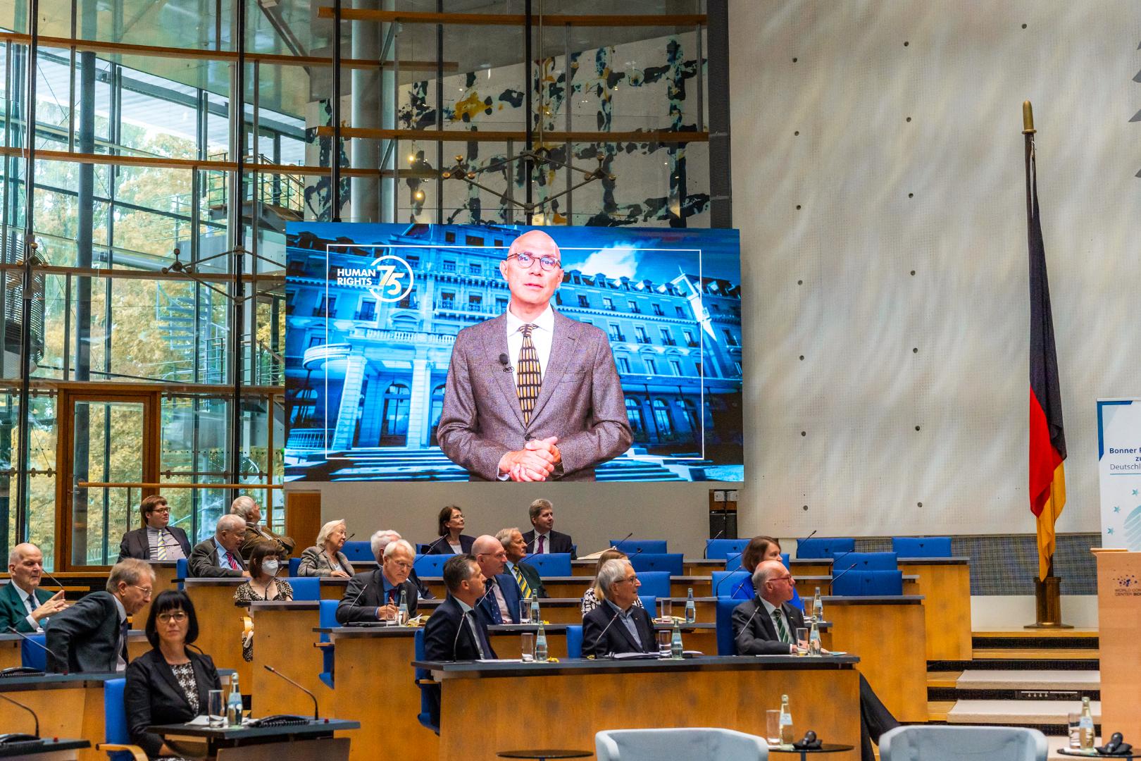 Seit 1945 habe es inner- und zwischenstaatlich mehr als 245 Kriege gegeben – mit Millionen Opfern. Doch es sei nicht die Haltung angesichts solcher Entwicklungen zu verzagen: Deutschland sei sich als zweitgrößter Beitragszahler im System der Vereinten Nationen seiner besonderen Geschichte und Verantwortung bewusst und an dem Ziel der Friedenssicherung herausgehoben beteiligt. Den wichtigen Beitrag Deutschlands griff Volker Türk, Hoher Kommissar der Vereinten Nationen für Menschenrechte, in seiner anschließenden Videobotschaft auf und erinnerte an ein weiteres Jubiläum in diesem Jahr: die Unterzeichnung der Allgemeinen Erklärung der Menschenrechte vor 75 Jahren. Ohne Menschenrechte könnten die drei Säulen der Vereinten Nationen – Frieden, Sicherheit und Entwicklung – nicht erreicht werden.