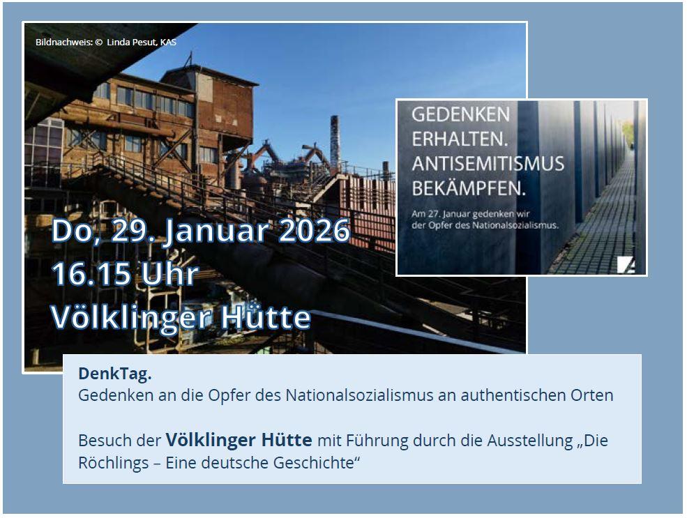 Im Rahmen eines Besuches im Weltkulturerbe Völklinger Hütte erinnert die Konrad-Adenauer-Stiftung im Saarland an einem authentischen Ort an die Opfer des National-sozialismus: Etwa 70.000 ausländische Arbeitskräfte und Kriegsgefangene arbeiteten während des Zweiten Welt-krieges in den Bergwerken, Hütten und Fabriken des Saar-reviers; in der Völklinger Hütte und ihren Nebenbetrieben waren 11.974 Männer, Frauen und Kinder als Zwangsar-beiter registriert. Unter ihnen französische, italienische und russische Kriegsgefangene oder aus der damaligen Sowjetunion verschleppte russische und ukrainische Zivilpersonen. Die Ausstellung zur Unternehmerfamilie „Die Röchlings – Eine deutsche Geschichte“ klärt auf. Wir laden Sie herzlich zur Teilnahme an dieser Veranstaltung am Donnerstag, den 29. Januar 2026 ein.
