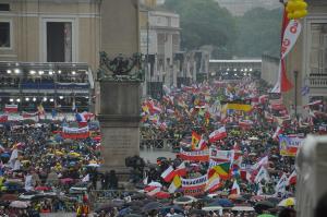 So wie Maria wollten es sich viele nicht nehmen lassen, bei der Heiligsprechung zweier Päpste dabei zu sein. Papst Franziskus feierte die Heilige Messe im Beisein seines Vorgängers, Benedikt XVI., der von den Menschen mit großem Beifall empfangen wurde. 150 Kardinäle, 1.000 Bischöfe und 6.000 Priester aus der ganzen Welt waren angereist, um der feierlichen Zeremonie beizuwohnen. Repräsentanten anderer Religionsgemeinschaften waren ebenfalls prominent vertreten.