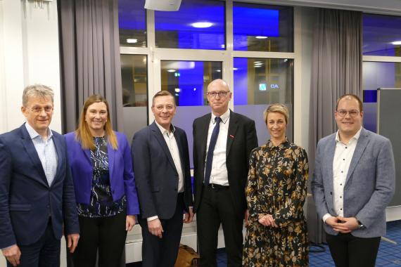 Die Gäste der Zukunftswerkstatt: (v.l.n.r.) Andreas Noll, Journalist, Prof. Dr. Natacha Valla, Ökonomin und Dekanin der Sciences Po, Paris, Nikolas Záboji, Wirtschaftskorrespondent der FAZ, Paris Martin Reuber
