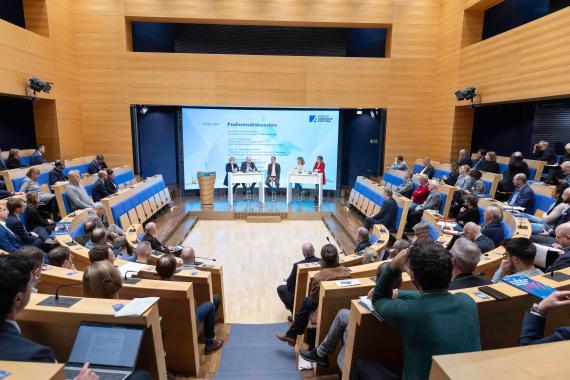 Foto der Veranstaltung mit Blick auf das Podium und das Publikum KAS / Leon Fülber