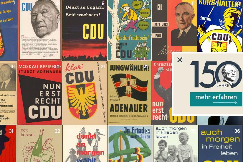 Zwischen 1949 und 1963 formte Konrad Adenauer als erster Bundeskanzler die junge Bundesrepublik Deutschland – politisch, wirtschaftlich und geopolitisch. Aus der „Stunde Null“ nach 1945 erwuchs mit der Gründung der Bundesrepublik 1949 ein demokratischer Neubeginn. Zugleich prägten Teilung, Kalter Krieg und der Wettstreit der Systeme den Alltag. Wahlplakate wurden zu Spiegeln ihrer Zeit: Sie verdichteten Sorgen, Hoffnungen und Zielkonflikte – vom Wiederaufbau über soziale Fragen bis hin zur Einbindung in das westliche Bündnissystem.