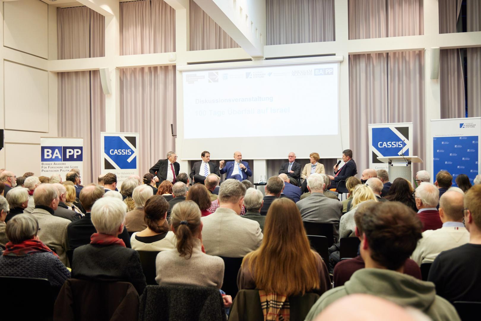 Der Andrang war groß. Mehr als 200 Zuschauer versammelten sich im Universitätsforum Bonn, um ihre Solidarität mit Israel zu bekunden. 100 Tage nach dem Angriff auf die einzige liberale Demokratie im Nahen Osten setzte die Konrad-Adenauer-Stiftung mit ihren Mitveranstaltern ein deutliches Zeichnen: für das Existenzrecht Israels, die völkerrechtlich legitime Selbstverteidigung gegen den Hamas-Terror und die Sicherheit jüdischer Bürgerinnen und Bürger in Deutschland.
