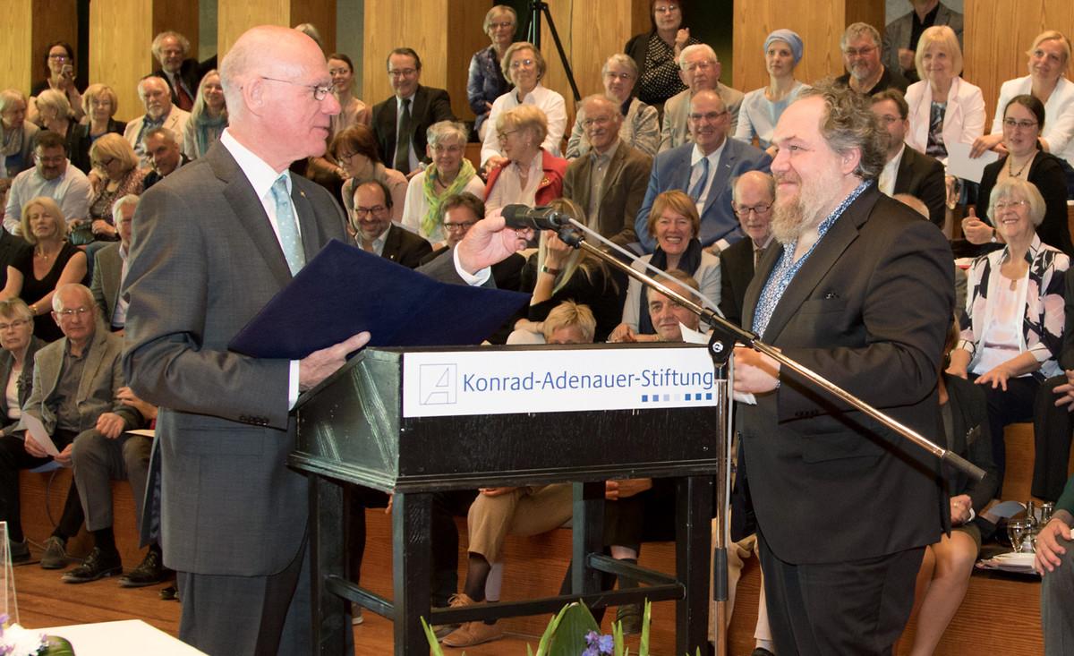 In seiner Ansprache zu Beginn der Feierlichkeiten verwies der Vorsitzende der Konrad-Adenauer-Stiftung, Prof. Dr. Norbert Lammert, Präsident des Deutschen Bundestages a.D., auf die Kontroverse um die Äußerungen von Uwe Tellkamp bei einer öffentlichen Veranstaltung mit Durs Grünbein vor der Leipziger Buchmesse in diesem Jahr. Der Vorsitzende bemängelte einen zuweilen immer wieder aufkommenden „Meinungskonformismus“ in der Literaturszene und im Feuilleton, der erwarte, dass nur eine bestimmte Meinung ausgesprochen werde und andere Haltungen besser verschwiegen werden. „Das ist ausdrücklich nicht unser Verständnis von Literatur oder von politischer Kultur“, betonte Lammert.