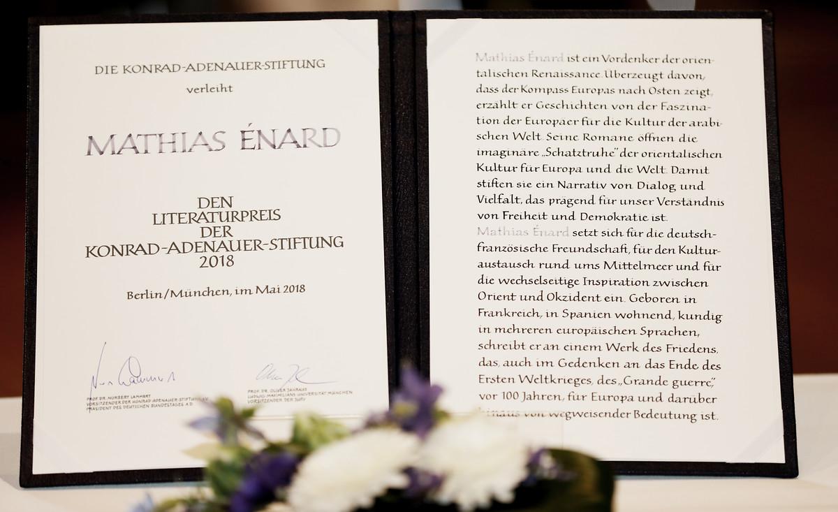 Die Laudatorin und Generalsekretärin der CDU Deutschlands Annegret Kramp-Karrenbauer, bezeichnete Énard als einen Hoffnungsträger. Denn in seinem umfangreichen Roman „Kompass“ (2015/2016) setze Énard ein Zeichen der Hoffnung, wonach sich Orient und Okzident vermischen. Énard ist kein Kläger oder Moralist seiner Zeit, sondern vielmehr ein epischer Beobachter. Er spare Krieg und Elend in seinen Romanen nicht aus.