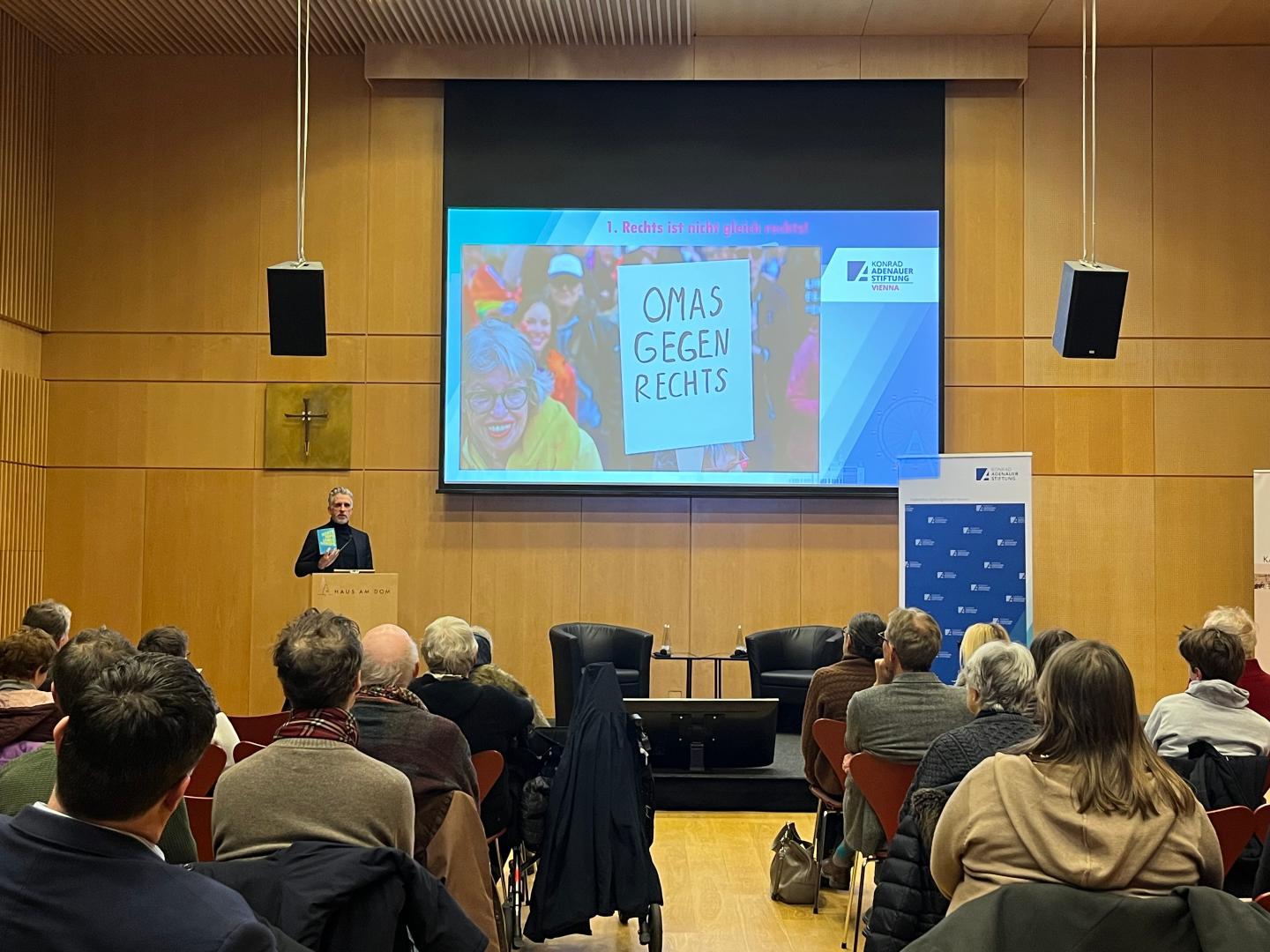 Im Fokus des Abends standen die Ergebnisse der Studie „Zwischen Abgrenzung, Einbindung und Tolerierung. Fallbeispiele für den Umgang mit rechtspopulistischen Parteien in Europa.“. Vorgestellt wurden diese von Sebastian Enskat, Leiter des Multilateralen Dialogs Wien der Konrad-Adenauer-Stiftung.