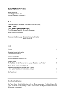 Nicht selten sind es Jubiläen, die uns dazu bewegen innezuhalten, kritisch zu reflektieren, welche Position wir zu bestimmten Themen einnehmen, wie es zu diesen Positionen kam und inwieweit diese möglicherweise im Laufe der Jahre verändert wurden. In diesem Fall ist es das hundertjährige Jubiläum des Buches von Ellen Key "Das Jahrhundert des Kindes", das 1900 einen Mythos vom Kinde verfestigte, der einer gesamten Epoche und vielleicht sogar diesem Jahrhundert als Grundlage für pädagogischen Enthusiasmus und Reformen diente. Wir stehen am Anfang eines neuen Jahrhunderts und müssen uns, besonders wenn wir politisch interessiert sind, fragen, inwieweit dieser Mythosbis heute seine Berechtigung hat, wodurch er möglicherweise abgelöst wurde, in jedem Falle aber inwieweit wir uns in Wissenschaft und Politik mit dem Thema gestaltend auseinandergesetzt haben.
