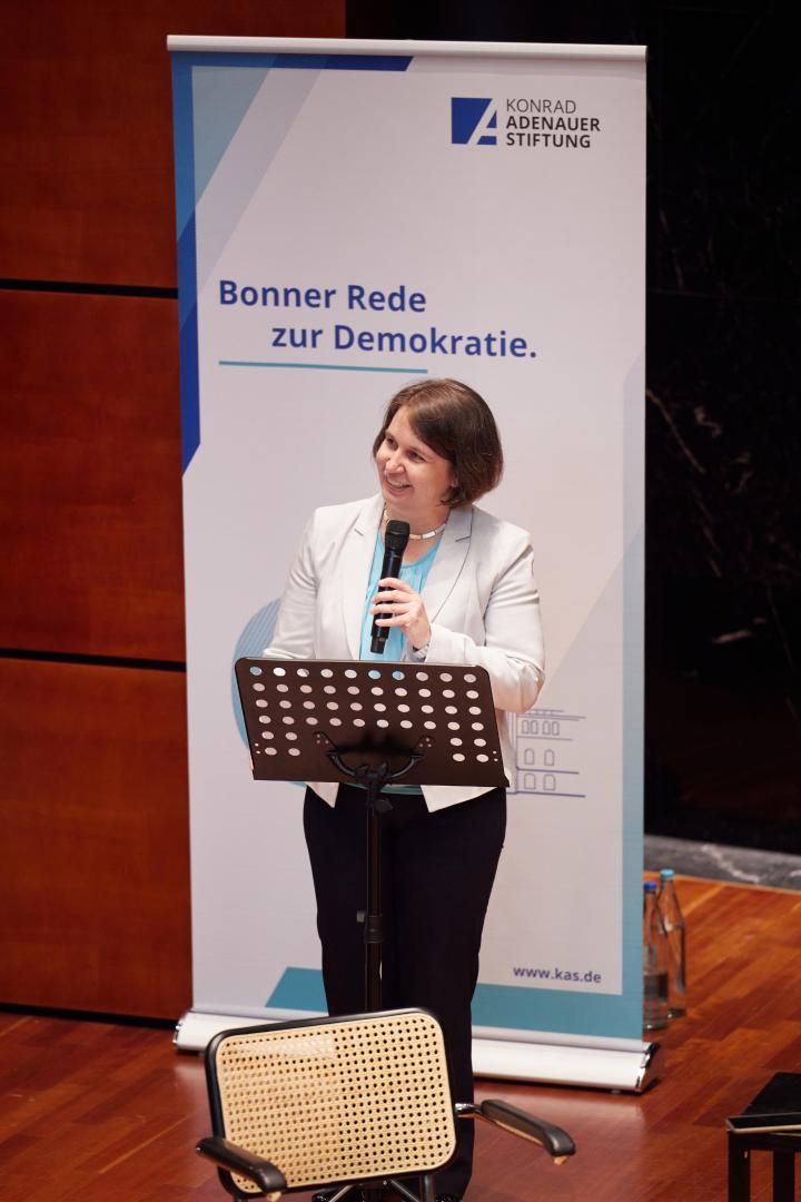 An dieser Stelle veränderte sich der Charakter der Podiumsdiskussion. Vorher noch Abfolge von wohl überlegten Statements, kam jetzt ein polemischer Ton hinein, der sich auf einen zentralen Diskussionspunkt dieser Zeit fokussierte. Die von Armin Laschet geforderte Nachdenklichkeit macht sich nämlich in der Sicht von Franziska Davies nicht an der Rolle der EU und der deutschen Regierung gegenüber Russland, spätestens seit 2014, fest. Davies und Laschet verhakten sich in der Frage, ob die deutsche Politik hätte anders handeln sollen, ob North Stream II, der Minsk-Prozess, die Energieabhängigkeit von Russland angesichts des sichtbar aggressiven Verhaltens der russischen Regierung nicht Fehler waren. Die Wissenschaftlerin klagte an, der Politiker warb um Verständnis für die jetzt fragwürdig gewordenen Jahre. Da war es Kermani, der Friedenspreisträger, der den Blick nach vorne richtete: Die jetzt entscheidende Frage könne es einzig und alleine sein, wie die Ukraine in einem freien und gesicherten Zustand aus dem Krieg herauskomme. Natürlich hatte auch er keine Antwort, aber er plädierte dafür, dass jetzt schon bei jeder Aktion des Westens die spätere Beendigung des Krieges im Blick bleibe.