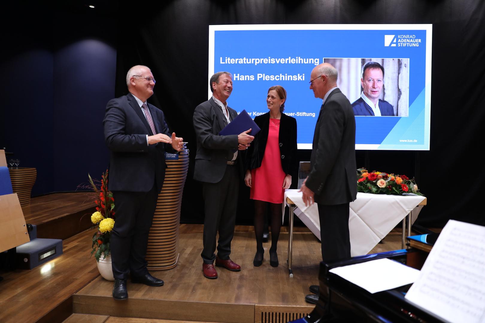 Welche politische Botschaft aus Pleschinskis Werken spreche, führte die schleswig-holsteinische Bildungs-, Wissenschafts- und Kulturministerin Karin Prien aus. In ihrer Laudatio würdigte sie Hans Pleschinskis Romane als „europäisches Gespräch“, das auf Kulturoptimismus statt Revisionismus setze und ein Kompass in unserer wertebeschleunigten Zeit sei. Von seinem Vater, der nach 1945 als Flüchtling nach Niedersachsen gekommen und dort Schmied geworden sei, habe er den Mut zu einer konservativ-liberalen Bürgerlichkeit. Dabei sei es nicht widersprüchlich, einen "gerechten Staat und humane Gesetzgebung“ zu wollen und zugleich die „Freiheit, Diskurse anzutreiben, Horizonte zu erweitern und Anstöße für die Zukunftsgestaltung zu geben“.