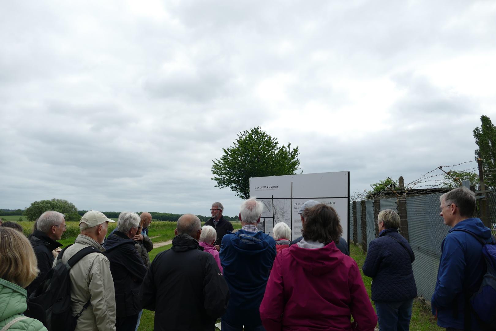 Der erste Stopp war das Museum GRENZHUS in Schlagsdorf. Zunächst führte uns Herr Müller, der schon während der Teilung beim Bundesgrenzschutz (BGS) arbeitete, über das Außengelände des Museums. Müller legte den Schwerpunkt der Führung auf seine Arbeit beim BGS. Der pensionierte Beamte war zehn Jahre lang in dem Gebiet rund um den Mechower See tätig. Zu seinen Aufgaben gehörten unter anderem die Abarbeitung von Streifenaufträgen als Gruppenführer und das Fotografieren der Grenze, um alle Veränderungen in Grenznähe stets im Blick zu haben.