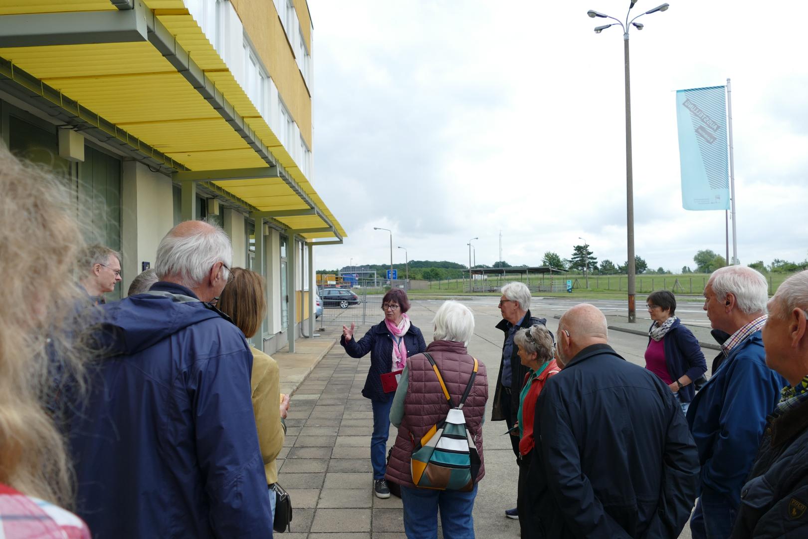 Dienstag machten wir uns auf den Weg zur Gedenkstätte Deutsche Teilung Marienborn. Die Gedenkstätte ist der ehemals größte Grenzübergang zwischen der Bundesrepublik und der DDR. Er wurde 1971 erbaut und 1974 in Betrieb genommen. Von dem ursprünglich 31 Hektar großen Gelände sind heute nur noch 7.3 Hektar übrig geblieben. Unser Guide Angelika Maedicke führte uns unter anderem zum Kommandantenturm sowie zu einer Baracke der DDR-Passkontrolle. Dort stellte sie zum Abschluss mithilfe von zwei Teilnehmenden eine Zoll- und Passkontrolle nach.