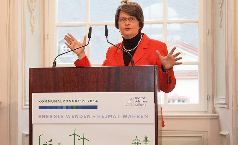 Inhaftierung Konrad Adenauers bis hin zur aktuellen Nutzung als Kulturzentrum. Mit Blick auf das Kongressthema mahnte Dr. Rüttgers, dass sich die Energiewende an den Grundsätzen der Sozialen Marktwirtschaft orientieren müsse. Dies bedeute, dass die betroffenen Menschen einzubeziehen und zu beteiligen seien. Außerdem müsse Deutschland weiterhin Industriestandort bleiben können. Schließlich sei die Europäische Einigung als Auftrag der Geschichte zu begreifen, was auch einen europäischen Energiemarkt erfordere, zog Dr. Rüttgers einen großen Bogen. PStS Dr. Maria Flachsbarth MdB betonte, dass die Energiewende unter dem Strich ein großer Erfolg sei, um den Deutschland beneidet werde. In unserem Land würden oft Hindernisse beklagt und zu selten die Chancen besprochen. Im offenen und transparenten Dialog auf Augenhöhe mit den Menschen müssten Politik und Bürgerschaft individuelle Lösungen erarbeiten. Auf diese Weise könnten Ängste beseitigt und eine „Dagegen-Kultur“ verhindert werden.Da die Kommunen die entscheidenden Informationen kommunizieren und Projekte verantworten müssten, seien sie auch angemessen an den Ergebnissen und Profiten zu beteiligen. Dr. Gerd Landsberg betonte ebenfalls die positiven Aspekte der „kommunalen Energiewenden“. Schon lange seien Ratssäle nicht mehr so gut besucht, lokale Akteure so stolz und kommunalpolitische Debatten so produktiv gewesen wie bei der Diskussion über örtliche Maßnahmen der Energiewende. Zugleich forderte Dr. Landsberg aber auch mehr finanzielle Unterstützung der Bundesregierung für Kommunikation und Aufklärung zur Energiewende. Dr. h.c. mult. Petra Roth hielt gegen Ende des Kongresses ein flammendes Plädoyer für selbsterwirtschaftete Energie in den Kommunen und für die Erschließung kluger Technologien zur Beschleunigung der Energiewende in den Städten und Gemeinden. Die Vorsitzende des Beirates Kommunalpolitik der Konrad-Adenauer-Stiftung appellierte an die Anwesenden, mehr Mut bei der Umsetzung der Energiewende an den Tag zu legen.