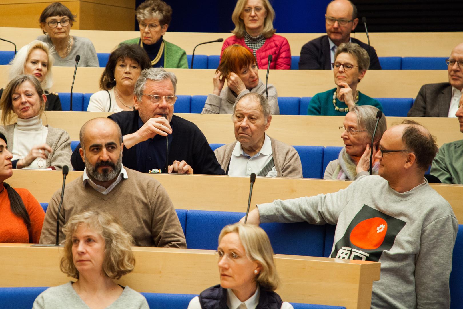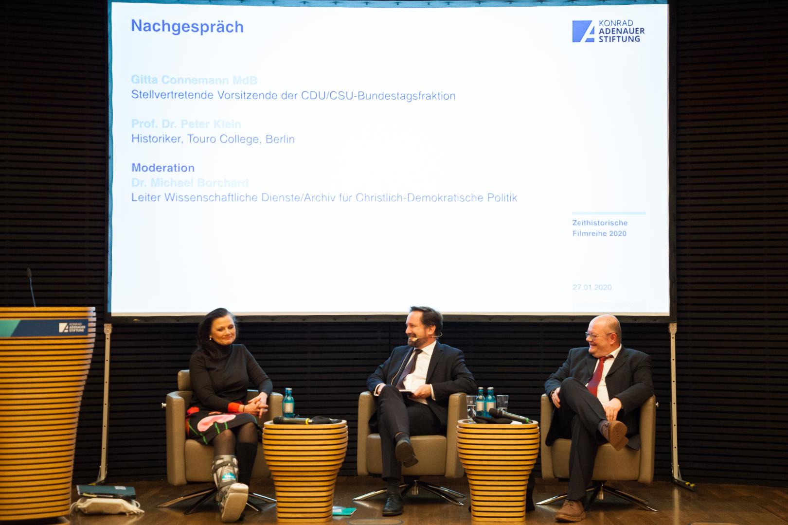 Im Nachgespräch diskutierte Dr. Michael Borchard, Leiter Wissenschaftliche Dienste/Archiv für Christlich-Demokratische Politik, mit Prof. Dr. Peter Klein, Historiker am Touro College Berlin, und Gitta Connemann MdB, Stellvertretende Vorsitzende der CDU/CSU-Bundestagsfraktion, über den Film und seine aktuellen Bezüge. Connemann unterstrich, dass der Film ein drängendes Problem thematisiere: Mit zunehmendem zeitlichen Abstand zu den Ereignissen wachse die Gefahr des Beschönigens und der Verfälschung der Ereignisse. Auf die Frage, ob man der Holocaust-Leugnung mit rechtlichen Mitteln überhaupt beikommen könne, erklärte Connemann – im Erstberuf Rechtsanwältin –, die Auseinandersetzung vor Gericht sei im Falle Irvings die einzig sinnvolle und im Ergebnis ja erfolgreiche Reaktion gewesen. Da Irving durch das Urteil gerichtlich als Lügner enttarnt wurde, dürfe er seitdem von jedermann als Holocaust-Leugner bezeichnet werden. In vielen Ländern habe er deshalb Einreiseverbot. Connemann plädierte außerdem dafür, den Kampf gegen Antisemitismus durch eine Schärfung des Straftatbestandes der Hetze auch juristisch zu führen. Außerdem müssten Schulen verpflichtend ein Angebot zum Besuch von Gedenkstätten bereitstellen. Schülerinnen und Schüler selbst solle und könne man aber nicht dazu zwingen.