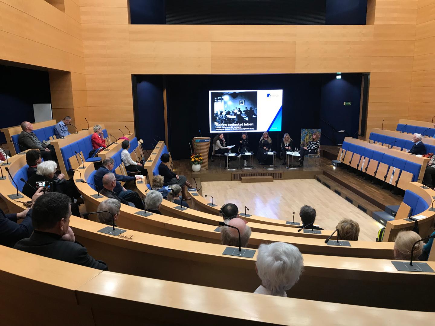 Themen der Gesprächsrunde waren insbesondere jüdische Wohlfahrtsstrukturen in Deutschland, die Rolle jüdischer Verbände bei der Identitätsbildung sowie die aktuelle Situation von Juden in Deutschland. Laura Cazes und Anna Staroselski berichteten ausführlich über die Arbeit und Zielsetzungen der Zentralwohlfahrtsstelle der Juden bzw. der Jüdischen Studierendenunion, bspw. über die Integration von Juden in die Gesellschaft als Langzeitaufgabe oder über das Empowerment junger Juden, um jüdische Perspektiven in gesellschaftlichen Diskussionen platzieren zu können. Diana Sandler informierte eingehend über ihre Arbeit als Vorsitzende einer von ihr gegründeten jüdischen Gemeinde und vergaß dabei auch nicht, auf verschiedene damit verbundene Herausforderungen hinzuweisen. Bezüge zum Leben Jacob Teitels und der Ausstellung zur heutigen Zeit stellte Dr. Elena Solominski in ihren Redebeiträgen dar. Deutlich wurde im Verlauf des Gesprächs herausgestellt, dass Antisemitismus ein reelles Problem für Juden in Deutschland darstellt.