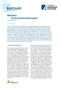 Es ist zu begrüßen, dass die neue Bundesregierung Antirassismus und Antidiskriminierung einen hohen Stellenwert beimisst. Das Thema ist von großer Bedeutung für den gesellschaftlichen Zusammenhalt. Die Bundesregierung sollte allerdings klar benennen, welches Verständnis von Rassismus und rassistischer Diskriminierung sie vertritt. Insbesondere, da sie angekündigt hat, das Allgemeine Gleichbehandlungsgesetz reformieren zu wollen. Es gibt mindestens vier grundlegende Fragen, die das Konzept des „strukturellen Rassismus“ aufwirft, wenn eine staatliche Stelle, wie die Antidiskriminierungsstelle des Bundes, das Konzept annehmen und operationalisieren würde.