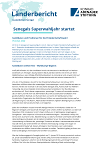 Derzeit verheißen die öffentlichen Verlautbarungen aller zugelassenen und nicht zugelassenen Kandidaten und ihrer Anhänger für die Wochen bis zur Präsidentschaftswahl am 24. Februar 2019 eine kontroverse und mitunter von politischen Unruhen geprägte Wahlkampfzeit. Die Konrad-Adenauer-Stiftung verfolgt gemeinsam mit dem westafrikanischen Think Tank Wathi sehr aufmerksam dieses Superwahljahr im Senegal und stellt die Kandidaten, Positionen und aktuellen Entwicklungen auf der eigens dafür geschaffenen Internetseite www.senegal2019.org vor.