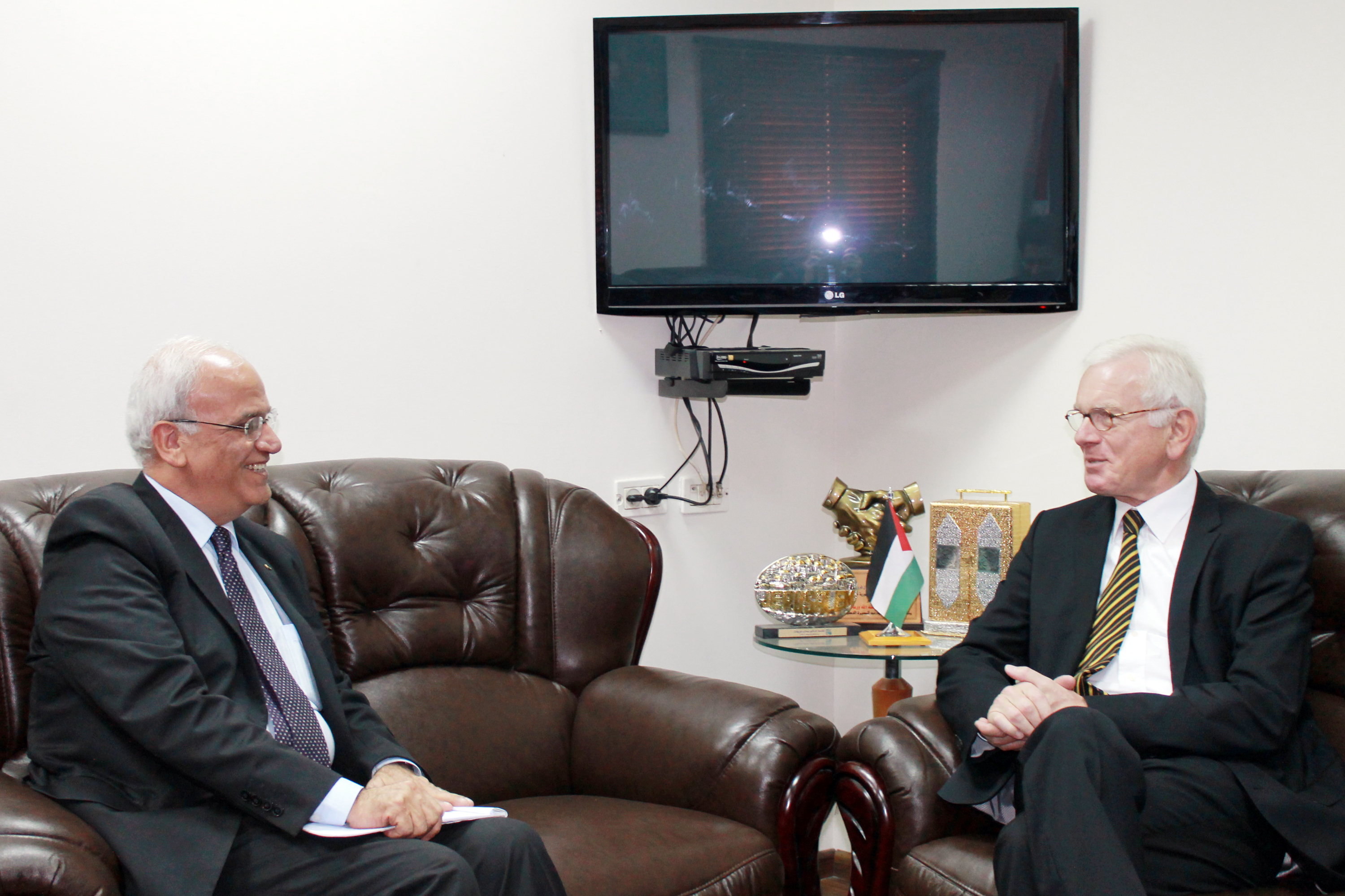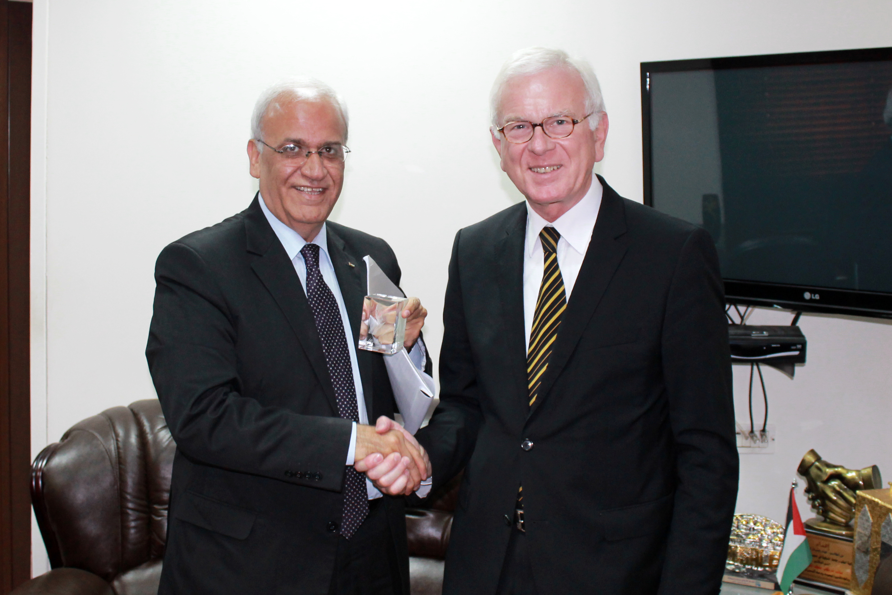 Dr. Hans-Gert Pöttering mit dem Leiter der palästinensischen Verhandlungsdelegation bei den gegenwärtigen Friedensgesprächen, Dr. Saeb Erekat