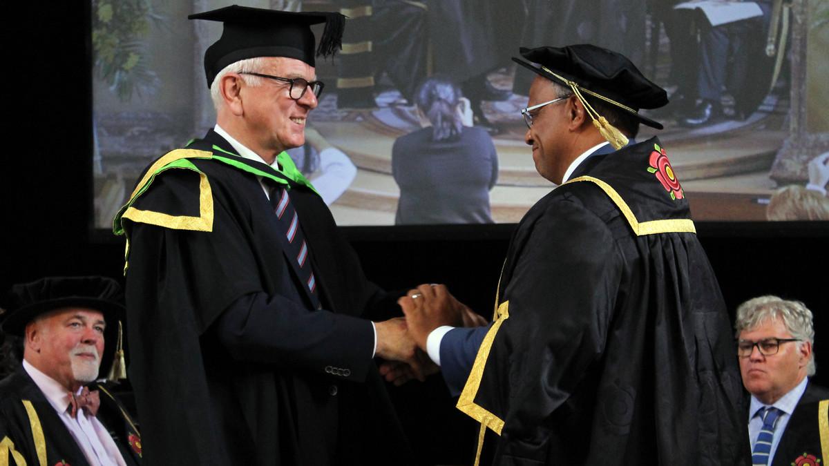 Lord Michael Hastings, Kanzler der Regent's University London, verleiht Dr. Hans-Gert Pöttering, Präsident des Europäischen Parlaments a. D. und Vorsitzender der Konrad-Adenauer-Stiftung, eine Ehrendoktorwürde für seine Verdienste um die europäische Einigung und die internationale Zusammenarbeit.