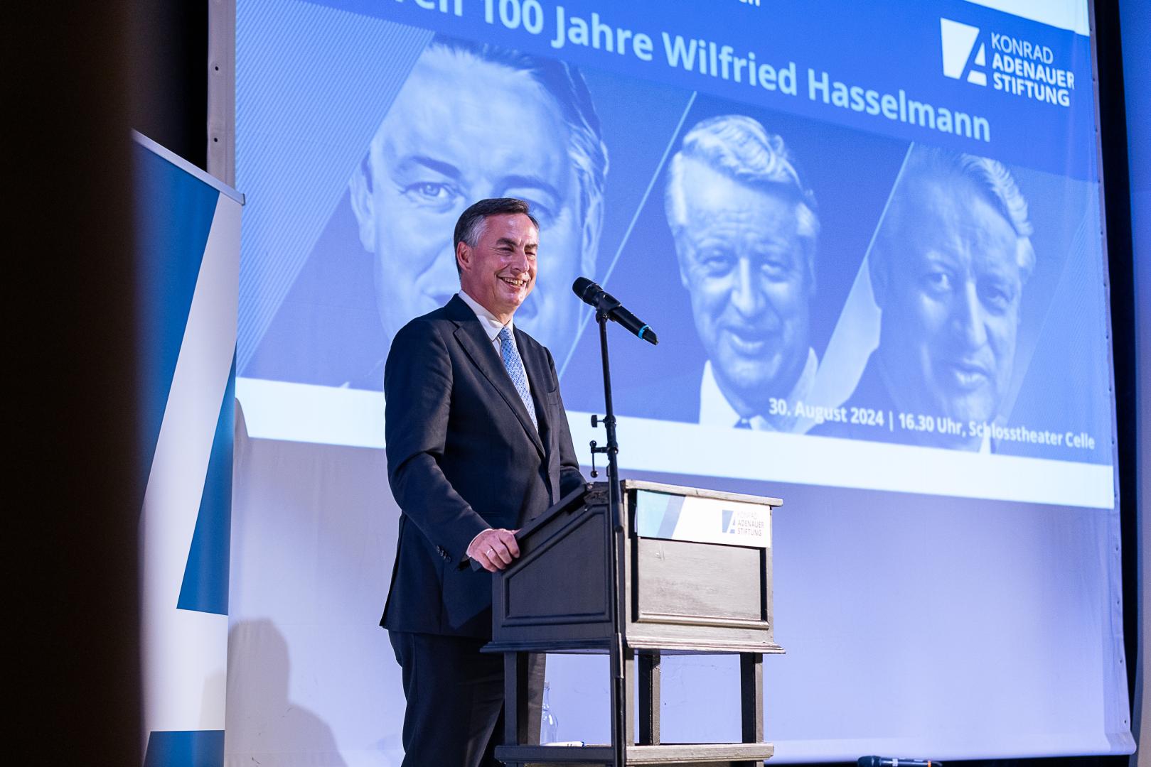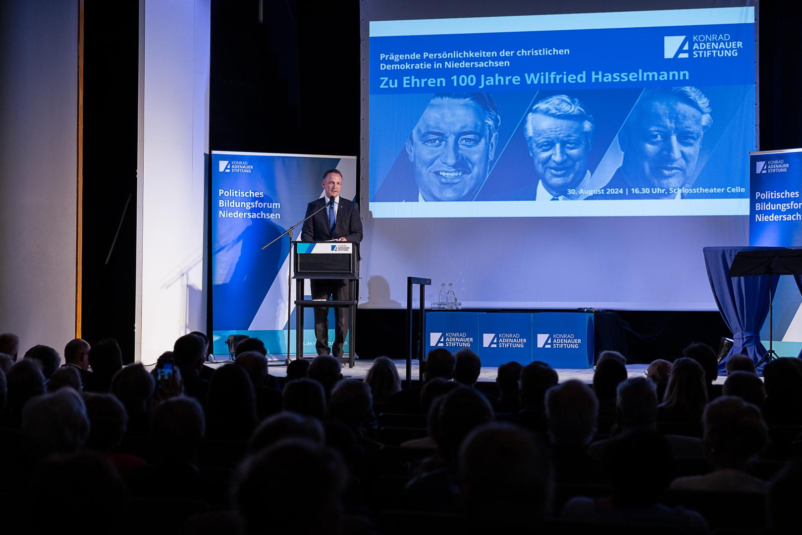 Festredner der Veranstaltung war der ehemalige Ministerpräsident David McAllister, der Hasselmann als junger Landtagsabgeordneter und im Wahlkampf 2003 als CDU-Generalsekretär kennengelernt hatte. Hasselmann sei über mehr als 20 Jahre lang die Integrationsfigur der CDU in Niedersachsen gewesen, sein politischer Weg sei von vielen großen Erfolgen, aber auch schweren Enttäuschungen geprägt gewesen. So habe er zweimal, bei der Landtagswahl 1970 und der Landtagswahl 1974, mit einem schwungvollen und leidenschaftlichen Wahlkampf glänzende CDU-Ergebnisse erzielt – doch die Machtperspektive blieb beide Male der Partei verwehrt. Er konnte, obwohl Spitzenkandidat, nicht Ministerpräsident werden. 1974 sei der Landtagswahlkampf kurz vor dem Wahltermin durch den Kanzlerwechsel von Willy Brandt zu Helmut Schmidt überschattet worden – plötzlich habe Landespolitik keine Rolle mehr gespielt. „Ein Mandat fehlte der CDU zur Mehrheit – und ich selbst kann sehr gut nachvollziehen, wie bitter dieser Moment für ihn gewesen sein muss“, sagte McAllister. McAllister selbst hatte bei der Landtagswahl 2013 mit einem hauchdünnen Ergebnis gegen Rot-Grün verloren – auch damals lag die Mehrheit für die neue Koalition bei nur einem Mandat im Landtag.
