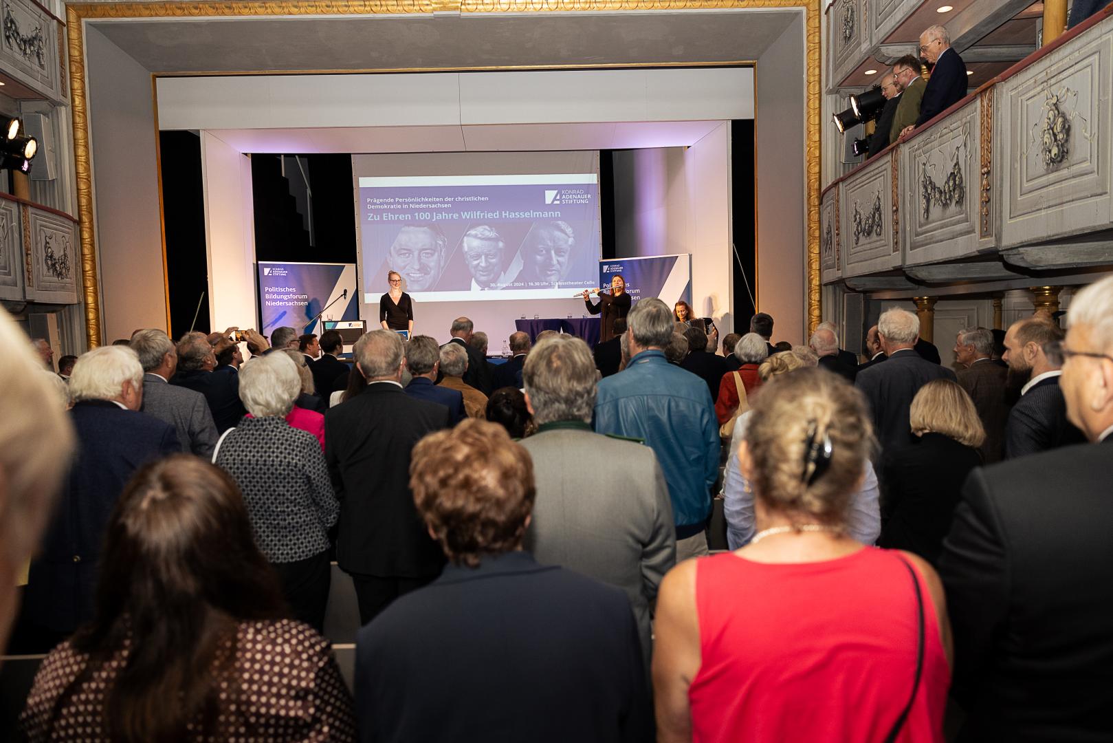 Im Celler Schlosstheater, einem festlich geschmückten Saal im Zentrum von Celle, der Heimat von Hasselmann, kamen am 30. August mehr als 200 Gäste zusammen, um dem langjährigen CDU-Landesvorsitzenden, Ehrenvorsitzenden, Minister und Landtagsabgeordneten zu gedenken. Darunter waren viele einstige Weggefährten, ehemalige Referenten und Getreue, Mitglieder seiner Familie und viele aktive niedersächsische CDU-Politiker. Zum Abschluss wurde – ganz so, wie es Hasselmann gefallen hätte – das Niedersachsen-Lied gesungen.