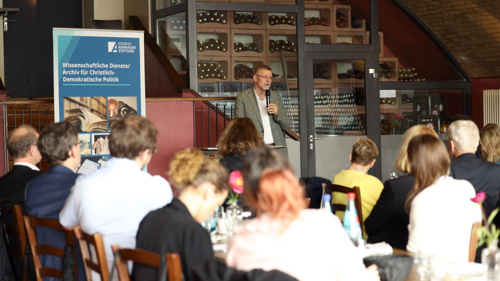 Daran anknüpfend verwies Thomas Brechenmacher, Professor für Neuere Geschichte an der Universität Potsdam, auf eine aktuelle Studie der Evangelischen Kirche in Deutschland. Demnach seien in der Bundesrepublik heute noch 25 Prozent römisch-katholisch und 23 Prozent evangelisch. Kirchlich religiös seien nur 13 Prozent, während für 56 Prozent Religion keinerlei Rolle mehr spiele. „Für eine Partei, die das ‚C‘ im Namen trägt, sind das dramatische Befunde“, so Brechenmacher.