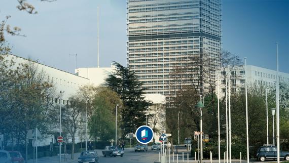 Das Bonner Bundeshaus (vorne) und der „Lange Eugen“ mit Abgeordnetenbüros, 1967. Bundesregierung/Foto: Arne Schambeck
