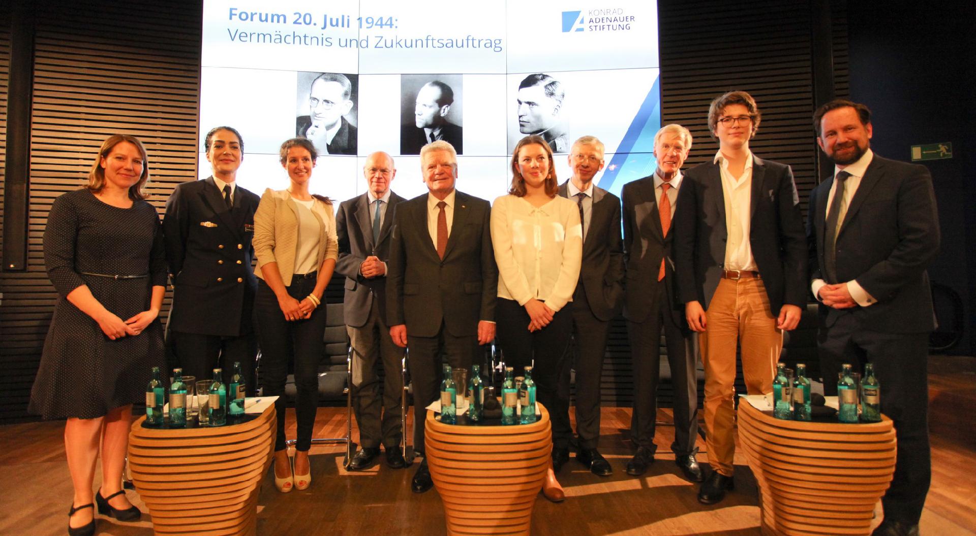 In der anschließenden Podiumsdebatte diskutierte Gauck mit Annette von Schlabrendorff, Mitglied des Vorstands der Stiftung 20. Juli 1944, Leutnant zur See Nariman Hammouti-Reinke sowie Lilly Anacker und Jesko von Bernuth, Schülern des Willy-Graf-Gymnasiums beziehungsweise der Sophie-Scholl-Schule. Zahlreiche Schülerinnen und Schüler dieser Schulen sowie des Gymnasiums Steglitz und des Europäischen Gymnasiums Bertha-von-Suttner waren in diesem Jahr erstmals gezielt zu der Veranstaltung eingeladen worden und hatten bereits am Nachmittag Gelegenheit, an einem durch die Gedenkstätte Deutscher Widerstand organisierten Workshop teilzunehmen. Die Leitfrage der Diskussion, sagte dann auch Dr. Michael Borchard, der Leiter der Hauptabteilung Wissenschaftliche Dienste der Konrad-Adenauer-Stiftung, solle nicht lauten, „was hätte ich damals getan“, sondern „was kann ich heute tun“. Dabei wurde deutlich, dass Schulen und Bildungssysteme einen Beitrag leisten können und müssen, um das Freiheitsbewusstsein und den Mut von Schülern und Bürgern zu bestärken. Schule solle vor allem „dazu beitragen, dass man Haltung entwickelt“, betonte Schlabrendorff. Die Aufgabe der Lehrer sei es dabei, Geschichten zu erzählen und Interesse zu wecken und damit etwa auch die Erinnerung an den Widerstand lebendig zu halten. Dies bejahten auch Anacker und Bernuth. Beide wünschten sich einen Unterricht, der sie persönlich anspricht und die Lebenserfahrung der Schüler in den Blick nimmt. Aus Sicht einer Soldatin mit „Migrationshintergrund“, wie sie sagte, äußerte sich Hammouti-Reinke zur Bedeutung von Werten und damit auch zur Bedeutung der Erinnerung an den Widerstand. Als wichtigsten Wert nannte Hammouti-Reinke dabei das Recht, insbesondere das Grundgesetz, das den Einsatz und das Handeln der Streitkräfte heute legitimiere. In der Praxis schließt dies auch die Möglichkeit zur Befehlsverweigerung ein, denn „wenn ein Befehl heute eine Straftat beinhaltet, muss der Soldat nicht gehorchen“.