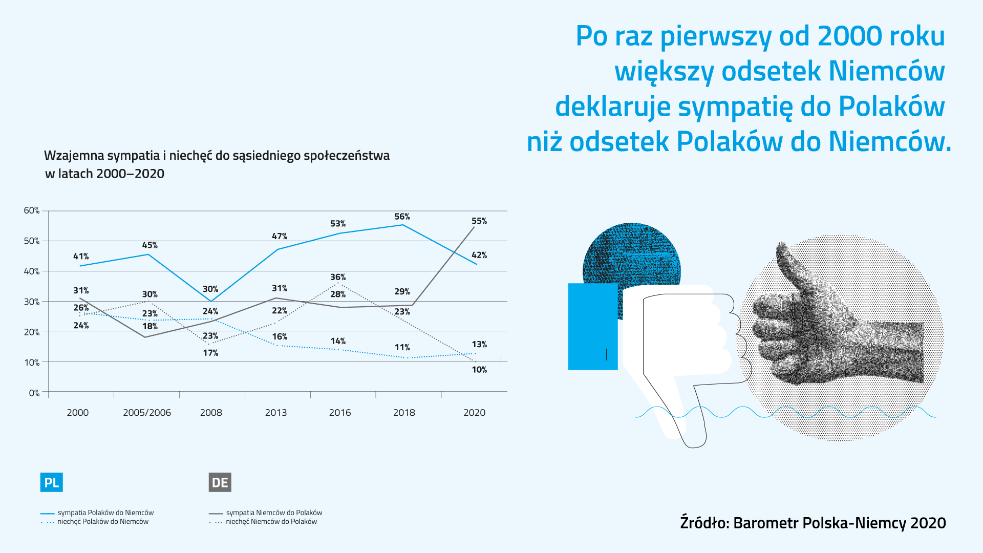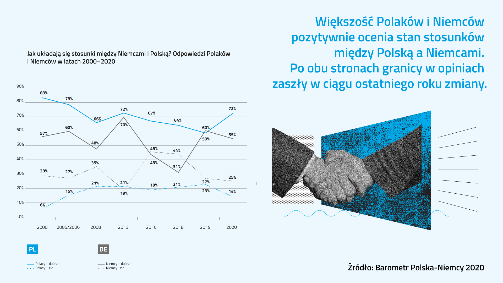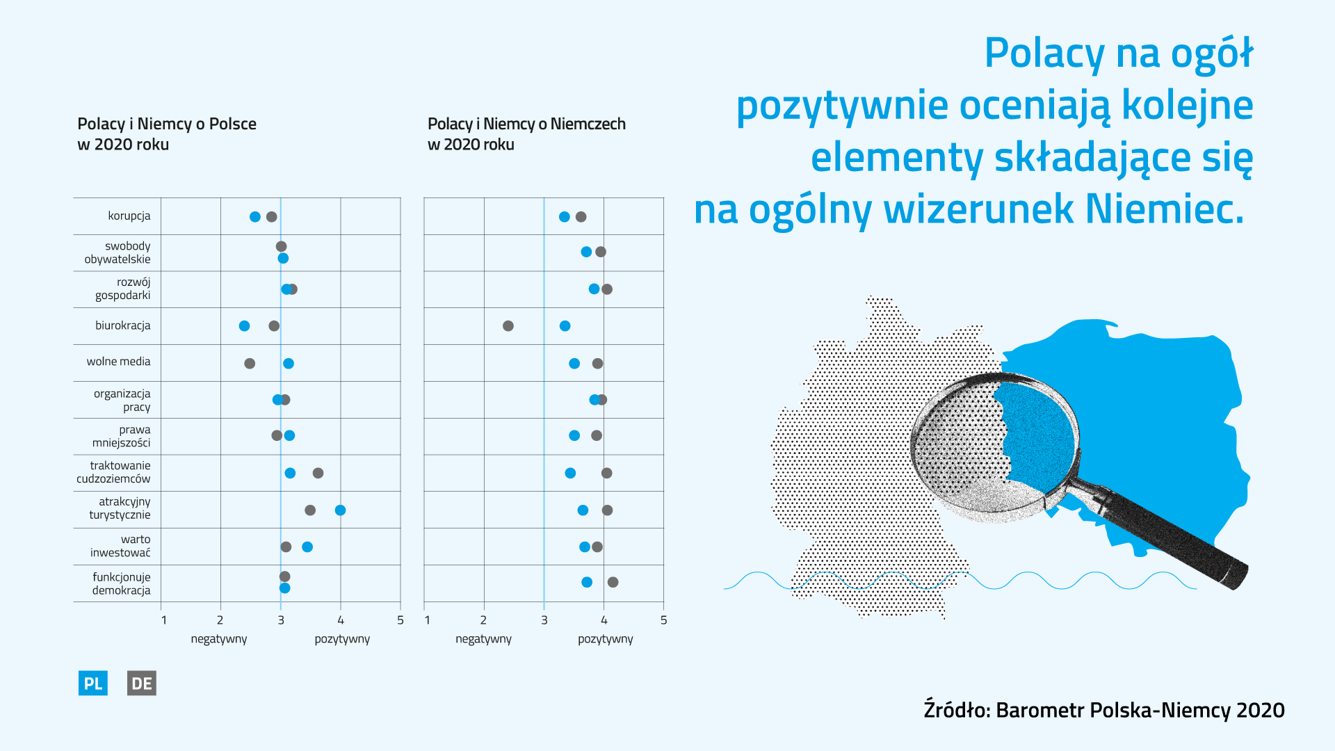 Badania z serii Barometr Polska-Niemcy prowadzone są przez Instytut Spraw Publicznych i Fundację Konrada Adenauera, obecnie również z Deutsches Polen-Institut i Fundacją Współpracy Polsko-Niemieckiej od 2000 roku. Pozwalają one obserwować dynamikę zmian we wzajemnym wizerunku Polaków i Niemców. Do tej pory zwłaszcza obraz Niemiec w Polsce był dobry i ulegał poprawie. W porównaniu do badań z 2018 roku wizerunek Niemiec w Polsce pogorszył się. Odsetek pozytywnych opinii o rozwoju gospodarki czy funkcjonowania państwa spadł, ale nie wzrósł jednocześnie odsetek ocen negatywnych. Więcej Polaków wystawia za to oceny ambiwalentne. Obraz Niemiec w oczach Polaków jest jednocześnie lepszy niż obraz własnego kraju. „Opinie Polaków na przykład na temat stanu polskiej demokracji czy gospodarki są bardzo podzielone i związane z ich preferencjami politycznymi,” opisuje te dane dr Jacek Kucharczyk z Instytutu Spraw Publicznych, współautor raportu z badania. „Z kolei niemieccy badani oceniają Polskę jako kraj lepiej niż w 2018 roku (kiedy zanotowano regres ocen pozytywnych), ale nadal około połowy Niemców nie ma opinii lub ma ambiwalentne opinie o Polsce, kiedy oceniają funkcjonowanie polskiej demokracji, wolność mediów, poziom korupcji czy biurokracji. Natomiast niemieckie oceny o własnym państwie są zdecydowanie pozytywne.” dodaje.