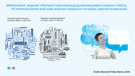 Prawie jedna trzecia (30%) skojarzeń Polaków z Niemcami jest związana z tematyką wojenną. Hasła opisujące Niemcy jako kraj silnej gospodarki i dobrobytu stanowią 14% asocjacji respondentów z Polski, a 8% wiąże się z kulturą, turystyką i językiem. Tymczasem po niemieckiej stronie właśnie ta grupa skojarzeń z Polską jest najliczniejsza (29%), a jej liczebność wzrosła. Skojarzenia związane z historią zajmują 7%. Rzadziej niż w ostatnich latach Niemcy wiążą Polaków z przestępczością i nieporządkiem (4%). „Bardzo cieszy, że dla Niemców Polska jest coraz częściej atrakcyjnym turystycznie krajem, kojarzonym z pięknymi miejscami na wypoczynek”, komentuje wyniki dr Agnieszka Łada z Deutsches Polen-Institut, współautorka badań. „Po polskiej stronie wyraźny jest wzrost emocjonalnych skojarzeń związanych z najtrudniejszym rozdziałem wspólnej historii– od 2016 roku odsetek tych skojarzeń podniósł się z 21%, coraz rzadziej Polacy zaś myślą o Niemczech jako o kraju o wyższym standardzie życia i rozwoju.