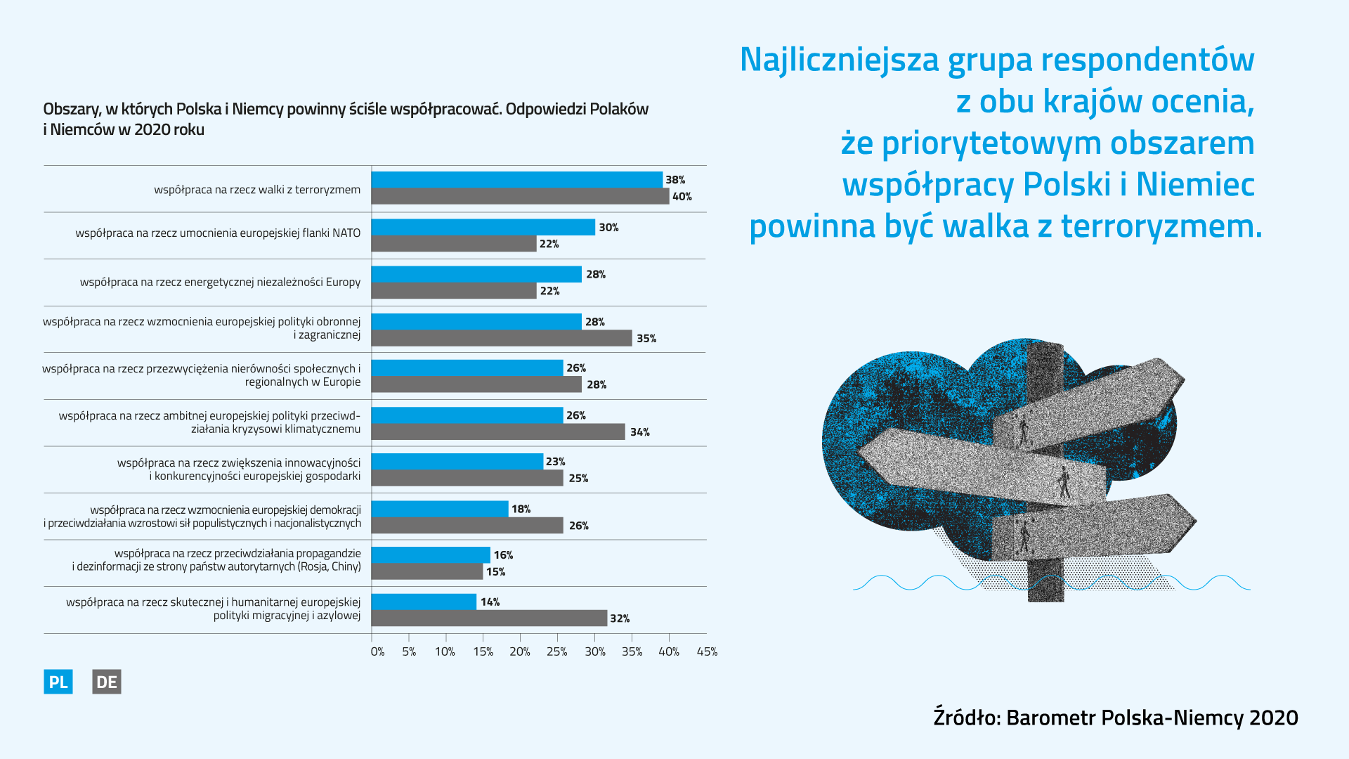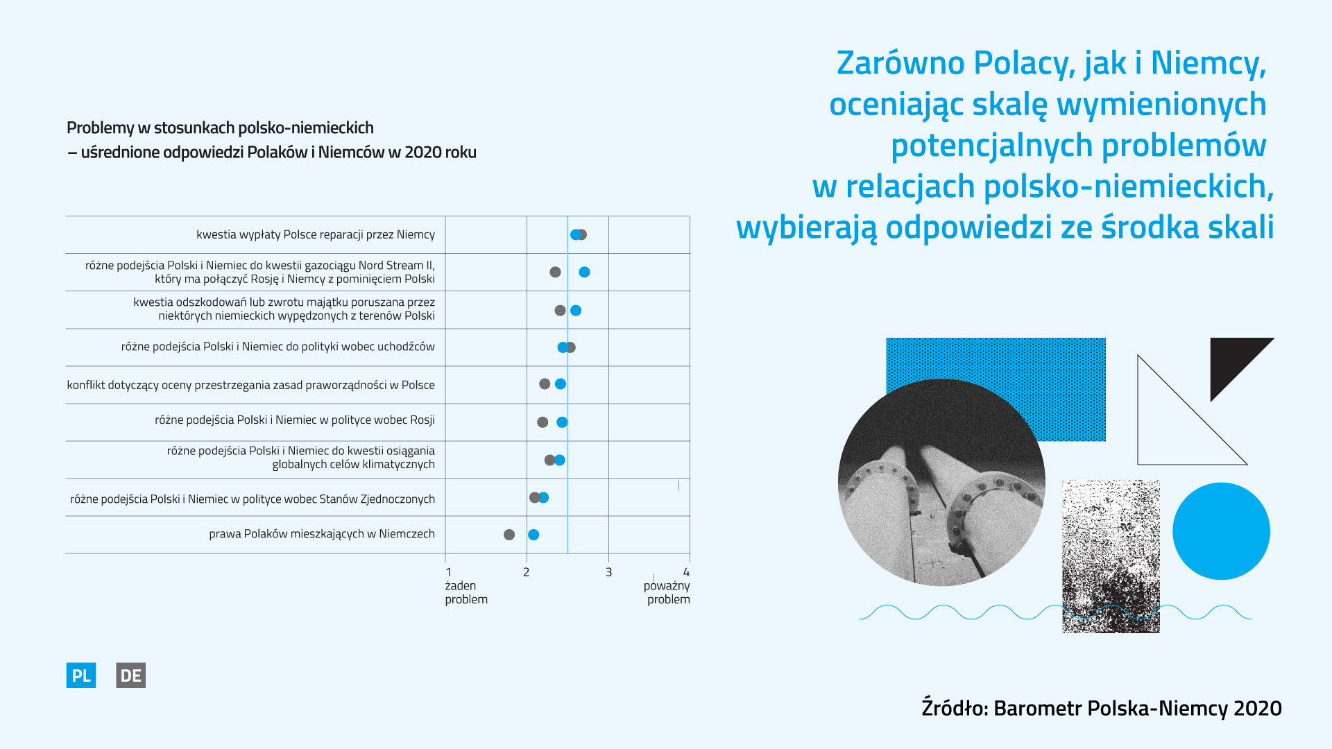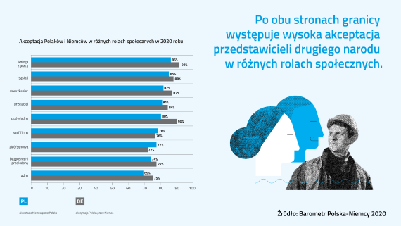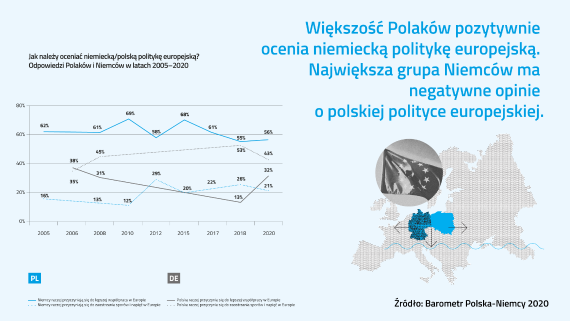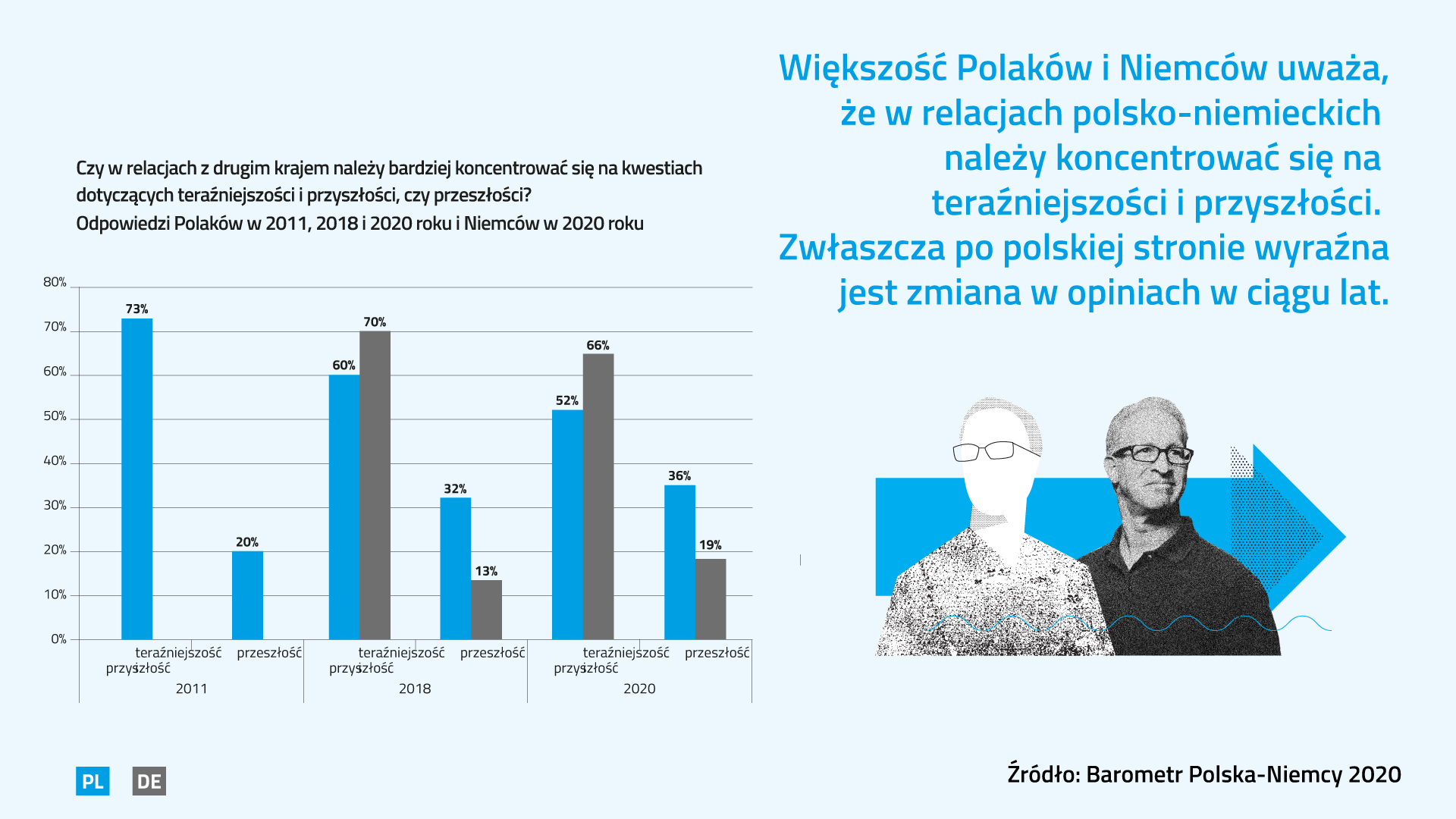 Większość Polaków (52%) i Niemców (66%) uważa, że w relacjach polsko-niemieckich należy koncentrować się na teraźniejszości i przyszłości, choć odsetek Polaków tak twierdzących przez lata się zmniejszał (w 2011 roku – 73%, w 2018 roku – 60%). W 2020 roku 36% Polaków uważa, że przede wszystkim trzeba się skupić na przeszłości. Po niemieckiej stronie zmiana jest mniejsza. Odsetek badanych, którzy preferują zajmowanie się we wzajemnych relacjach teraźniejszością i przyszłością, spadł o cztery punkty procentowe, podczas gdy odsetek osób wybierających przeszłość wzrósł o sześć punktów procentowych.