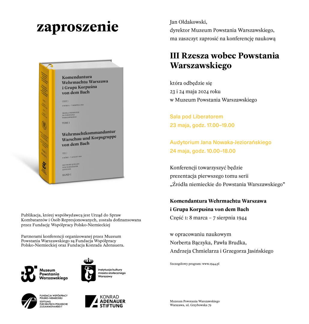 Konferencji towarzyszyć będzie prezentacja pierwszego tomu źródeł niemieckich do historii Powstania Warszawskiego „Komendantura Wehrmachtu Warszawa i Grupa Korpuśna von dem Bach. Część 1: 8 marca – 7 sierpnia 1944 r.” w opracowaniu naukowym Norberta Bączyka, Pawła Brudka, Andrzeja Chmielarza i Grzegorza Jasińskiego.