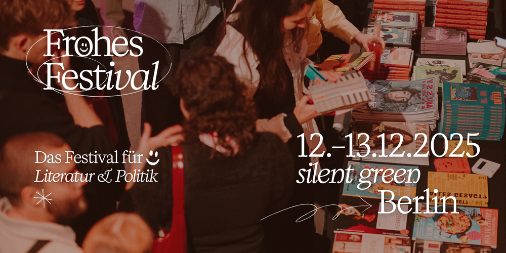 Am 12. und 13. Dezember wird im Silent Green in Berlin in Kooperation mit Holtzbrinck Berlin das literarische und politische Literaturfestival „Frohes Festival“ veranstaltet. In einem festlichen und zwanglosen Setting wird mit bekannten Autoren, Newcomern und Journalisten gesellschaftspolitische Themen verhandelt. Zwischen Paneltalks, Lesungen, Workshops, Screenings, Live-Podcasts und weiteren Formaten stehen Literatur, Politik und das Miteinander im Fokus.